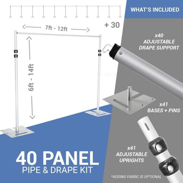 DELUXE-40 Panel Pipe and Drape Kit / Backdrop - 6-14 Feet Tall (Adjustable) Comes W/ 3 Piece Uprights for Maximum Height Adjustment