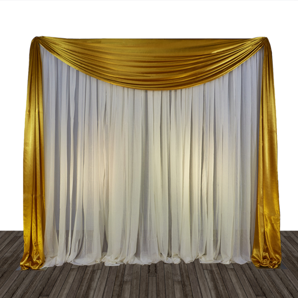 Instructions: 1. Place bases on ground approx. 6-10 feet apart and slide uprights onto the bases. 2. Slide drape support through the rod pockets of the drapes and place between the uprights. 3. Spread the drape along the drape support so it looks even. Place drape support in slots on upright. 4. Using a ladder, attach the valance. This Kit Contains: • 2 10lbs Bases • 2 8ft Fixed Uprights • 4 10 foot pieces of your choice of Base Fabric (When selecting taffeta only 2 pieces of base fabric are provided due to the extra wide size) • 1 30 foot pieces of your choice of Swag/Valence Fabric • 1 6ft to 10ft Crossbar • 1 Event Supply Fabric Carrying Bag • 1 Instructional Video - SENT VIA EMAIL ($29.99 Value!) • 2 Valu 1.5" x 24" Extension for Fixed 8ft Upright - optional Lighting Options: • Par38 in Black (bulb not included) • Par36 in Black • Par64 in Black • 3.3FT Light Bar