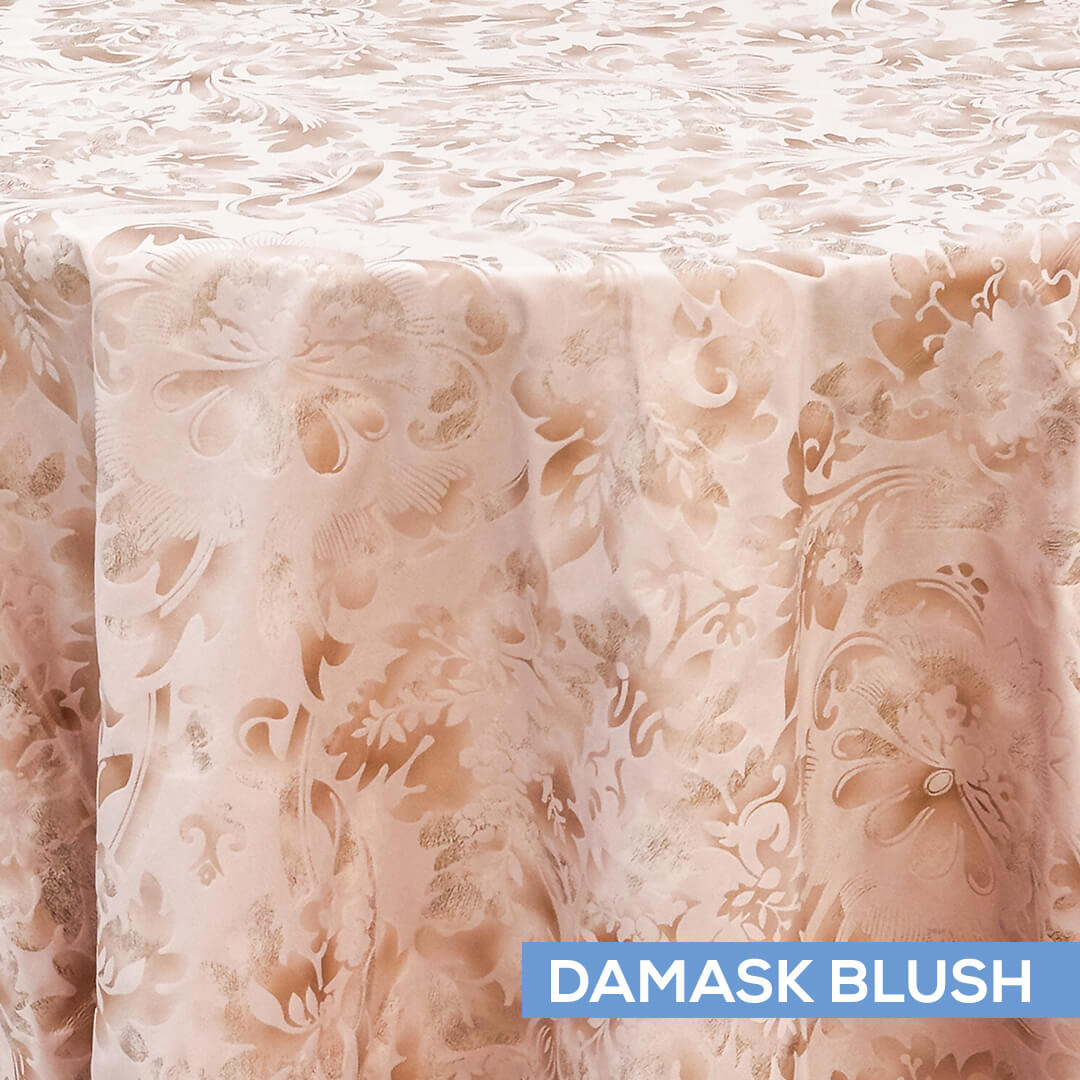 Add another touch of elegance to your event with some sleek, embellished tablecloths. They're perfect for weddings, parties, dinners, tradeshows, corporate events, and more. They will quickly become a staple in your toolbox for table decor whether you're planning your own party or are an event designer. You can even stock them in your linen closet year round for home decor. The damask blush hue makes them especially chic.