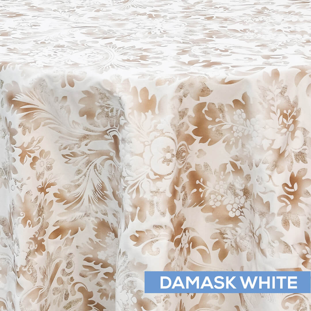 Add another touch of elegance to your event with some sleek, embellished tablecloths. They're perfect for weddings, parties, dinners, tradeshows, corporate events, and more. They will quickly become a staple in your toolbox for table decor whether you're planning your own party or are an event designer. You can even stock them in your linen closet year round for home decor. The damask white hue makes them especially classic.