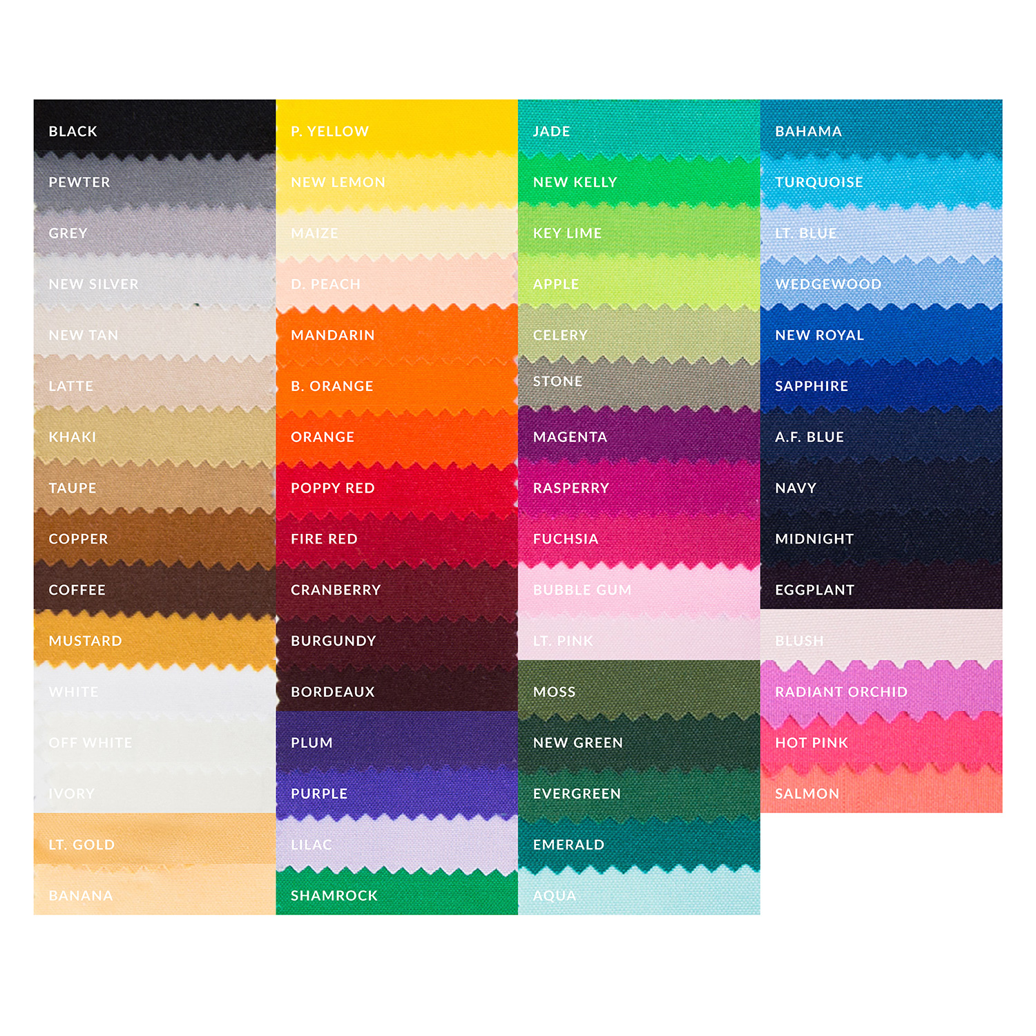 COLORS: A.F. Blue, Apple, Aqua, B.Orange, Bahama, Banana, Black, Bordeaux, Bubble Gum, Burgundy, Celery, Coffee, Copper, Cranberry, D.Peach, Eggplant, Emerald, Evergreen, Fire Red, Fuchsia, Ivory, Jade, Key Lime, Khaki, Latte, Lilac, Lt. Gold, Lt. Blue, Lt. Pink, Magenta, Maize, Mandarin, Midnight, Moss, Mustard, Navy, New Green, New Kelly, New Lemon, New Royal, New Silver, New Tan, Off White, Orange, P. Yellow, Pewter, Plum, Poppy Red, Purple, Raspberry