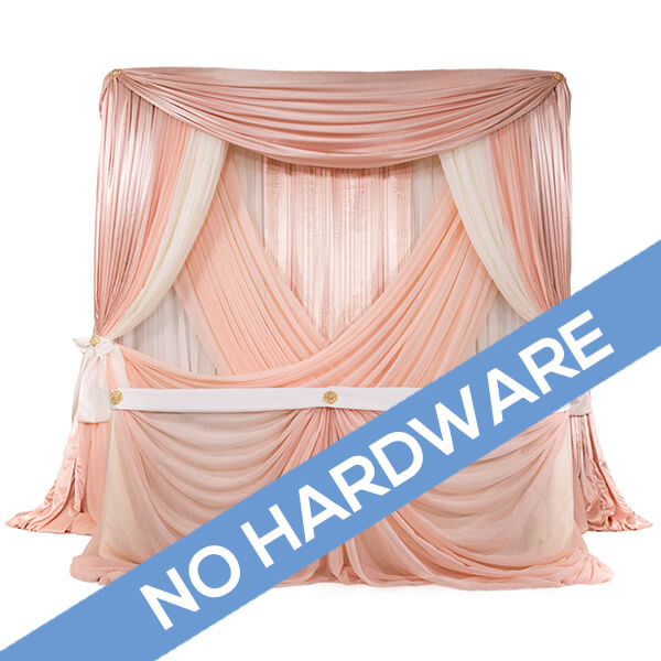 This kit includes flowing fabric with a soft muted tone. The included panels allow you to arrange a deluxe backdrop or a 4 Post Canopy with table draping/Cinderella skirting.