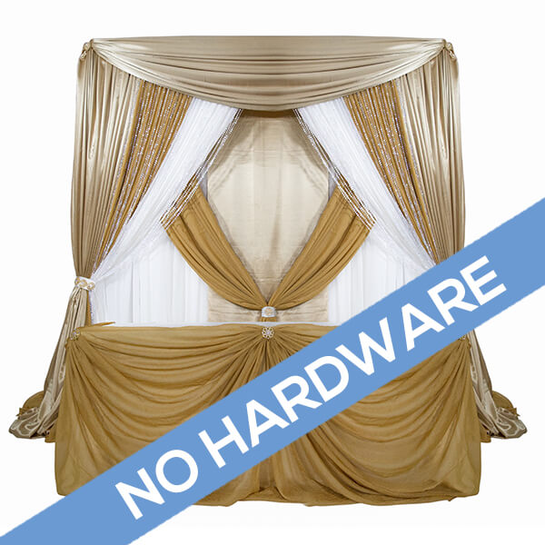 This Kit includes the following products: 10 x 10ft FR Crushed Sheer panels (Ivory) 4 x 21ft FR Crushed Sheer Panels (Gold) 1 x 30ft FR Crushed Sheer Panels (Gold) 4 x 21ft FR Satin Panel (Champagne) 1 x 30ft FR Satin Panel (your choice of White, Ivory, Black or Dark Purple) 1 x Cinderella Skirt (including 20 Brooches) 4 x Sashes (Ivory)