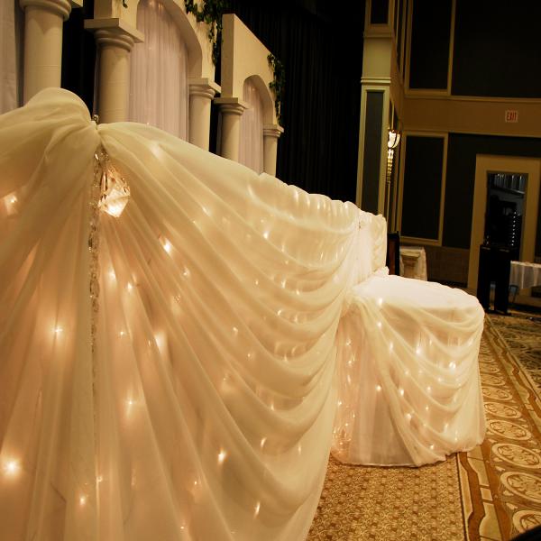 Create an enchanted world through your table decor with our beautiful 16 ft fairy light head table decoration kit. This fairy light kit allows you to decorate tables up to 16ft with flowing sheer fabric and our glowing fairy lights. We include sheer panels, all attachment equipment, fairy light strands, and instructions to get you started.