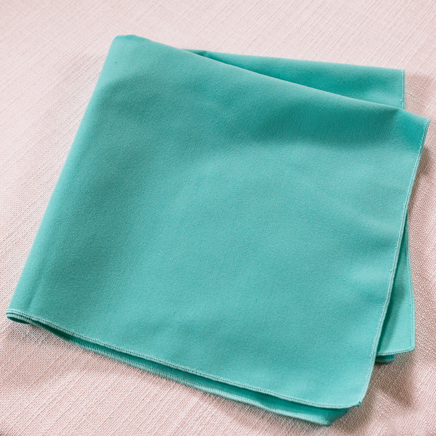 Dress your event and dinner tables with this wide polyester napkin that truly feels like cotton. Highly durable and made in the USA, this aqua blue colored napkin is a perfect addition to your décor, and holds up for reuse.