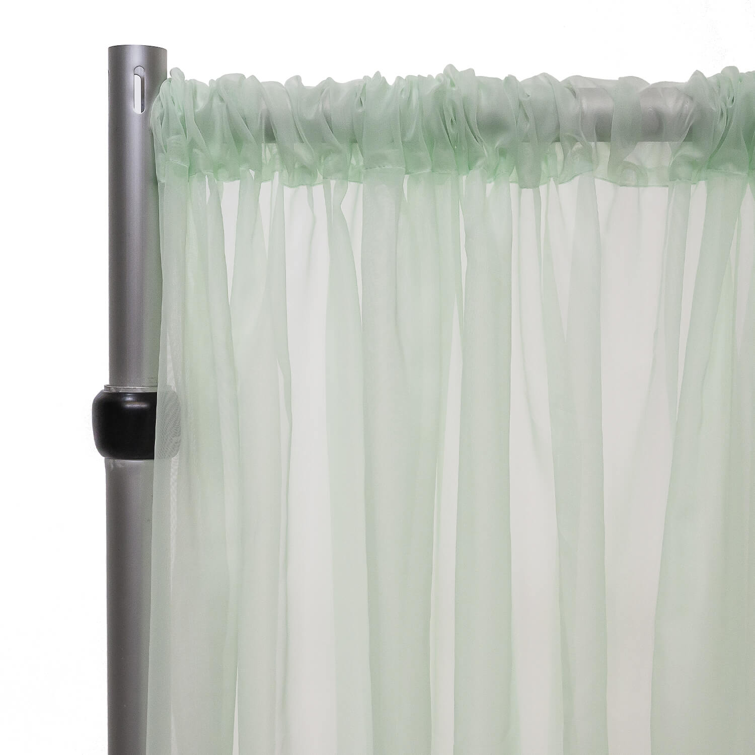 Accent and soften the ambiance with these spectacular curtain panels. The sheer features natural edges and is the same super-premium quality used in our backdrops and ceiling draping. And with 4" pocket rods on each end, you can hang them anywhere! Whether used as a backdrop or as a partition, they are just the lovely additions that the joyous occasion needs. Perfect for rustic or posh events, winter or spring. For best appearance when using as drape, we recommend using 4 or more pieces of 10ft wide sheer for every 10 feet of pipe.