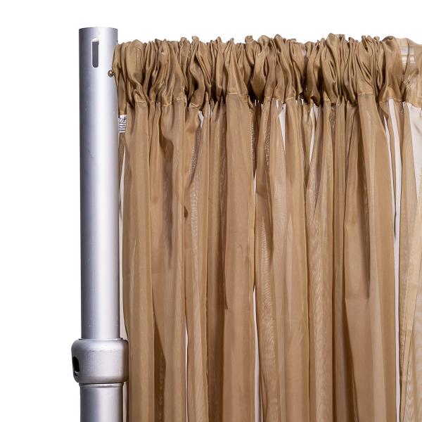 Accent and soften the ambiance with these spectacular curtain panels. The sheer features natural edges and is the same super-premium quality used in our backdrops and ceiling draping. And with 4" pocket rods on each end, you can hang them anywhere! Whether used as a backdrop or as a partition, they are just the lovely additions that the joyous occasion needs. Perfect for rustic or posh events, winter or spring. For best appearance when using as drape, we recommend using 4 or more pieces of 10ft wide sheer for every 10 feet of pipe.
