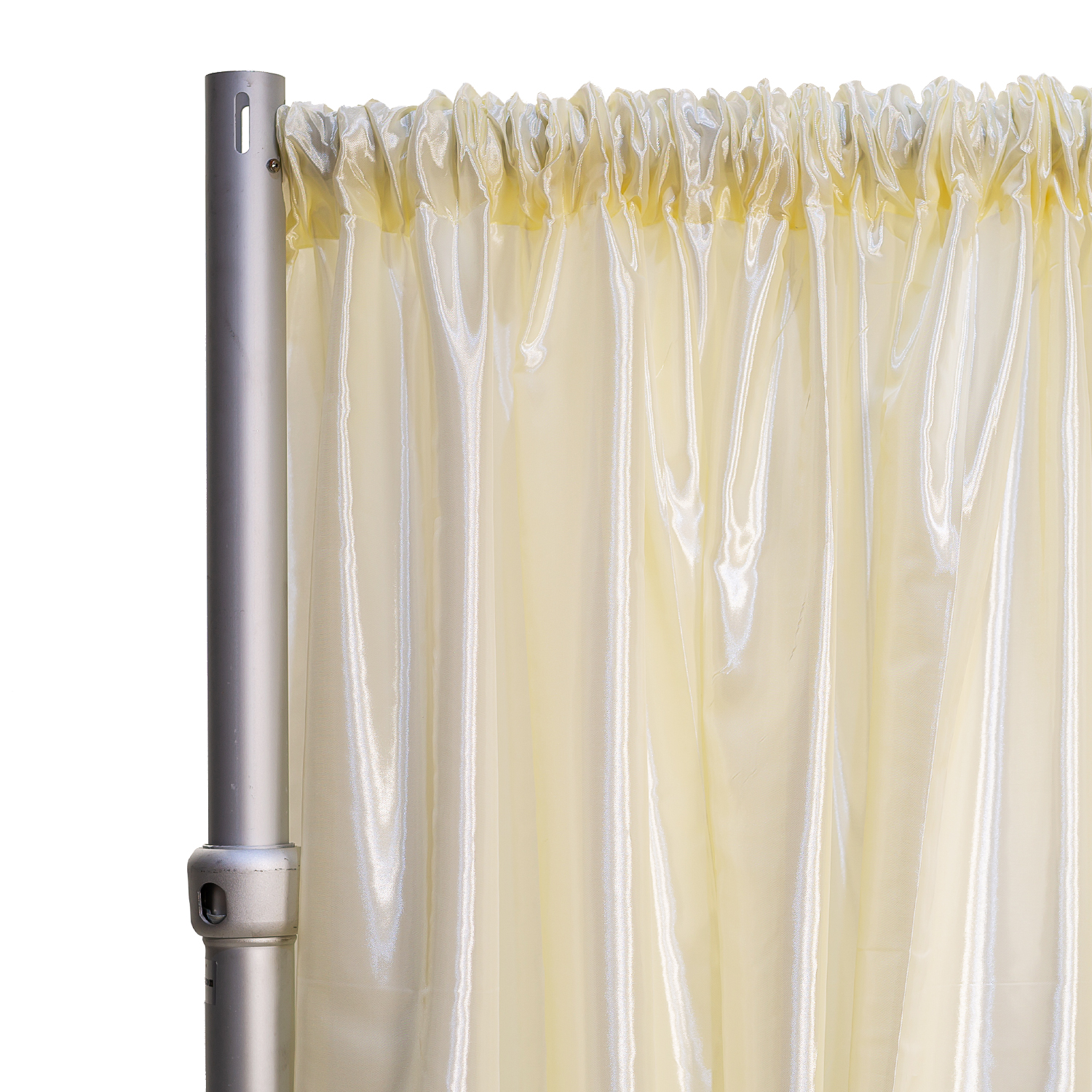 Accent and soften the ambience with these spectacular curtain panels. The taffeta features natural edges and is the same super-premium quality used in our backdrops and ceiling draping. And with 4" pocket rods on each end, you can hang them anywhere! Whether used as a backdrop or as a partition, they are just the lovely additions that the joyous occasion needs. Perfect for rustic or posh events, winter or spring. For best appearance when using as drape, we recommend using 3 pieces of 9 1/2 ft wide Taffeta for every 10 feet of pipe.