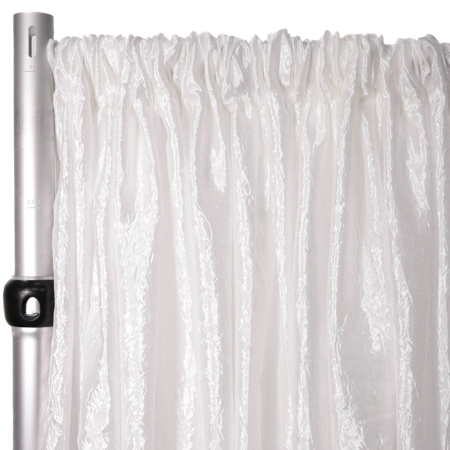 Add some texture and flair to your corporate events, tradeshows, weddings, and more with these crushed tergalet drape panels. Backdrops, ceiling panels, or partitions, the choice is yours! With a whole assortment of vibrant colors from which to choose, they are suitable for all manner of themes and events. The white hue also lends it an especially fresh and classic look, helping to mask those otherwise drab surfaces and liven up those wide, empty spaces. A durable and shimmery fabric, tergalet is a wonderful substitute for satin and now fire retardant! Super-premium quality guaranteed.