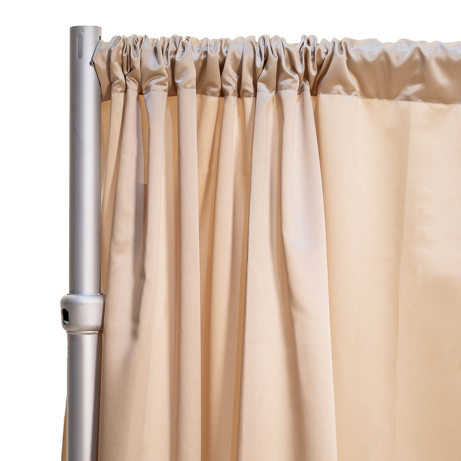 Accent and soften the ambience with these shimmering satin curtain panels. The satin features natural edges and is the same super-premium quality used in our luxe backdrops. And with 4" pocket rods on each end, you can hang them anywhere! Whether used as a backdrop or as a partition, they are just the lovely additions that the joyous occasion needs. Perfect for rustic or posh events, winter or spring. Often referred to as "bridal satin", this satin has slight matte finish which provides a beautiful shine only high quality fabrics can produce. For best appearance when using as drape, we recommend using 3-4 pieces of 5 ft wide luxe satin for every 10 feet of pipe. Sewing finishes such as rolled hem, surged edges and top finishes are available as upgrades.