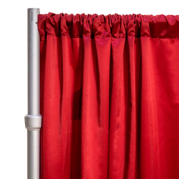 Accent and soften the ambience with these shimmering satin curtain panels. The satin features natural edges and is the same super-premium quality used in our luxe backdrops. And with 4" pocket rods on each end, you can hang them anywhere! Whether used as a backdrop or as a partition, they are just the lovely additions that the joyous occasion needs. Perfect for rustic or posh events, winter or spring. Often referred to as "bridal satin", this satin has slight matte finish which provides a beautiful shine only high quality fabrics can produce. For best appearance when using as drape, we recommend using 3-4 pieces of 5 ft wide luxe satin for every 10 feet of pipe. Sewing finishes such as rolled hem, surged edges and top finishes are available as upgrades.