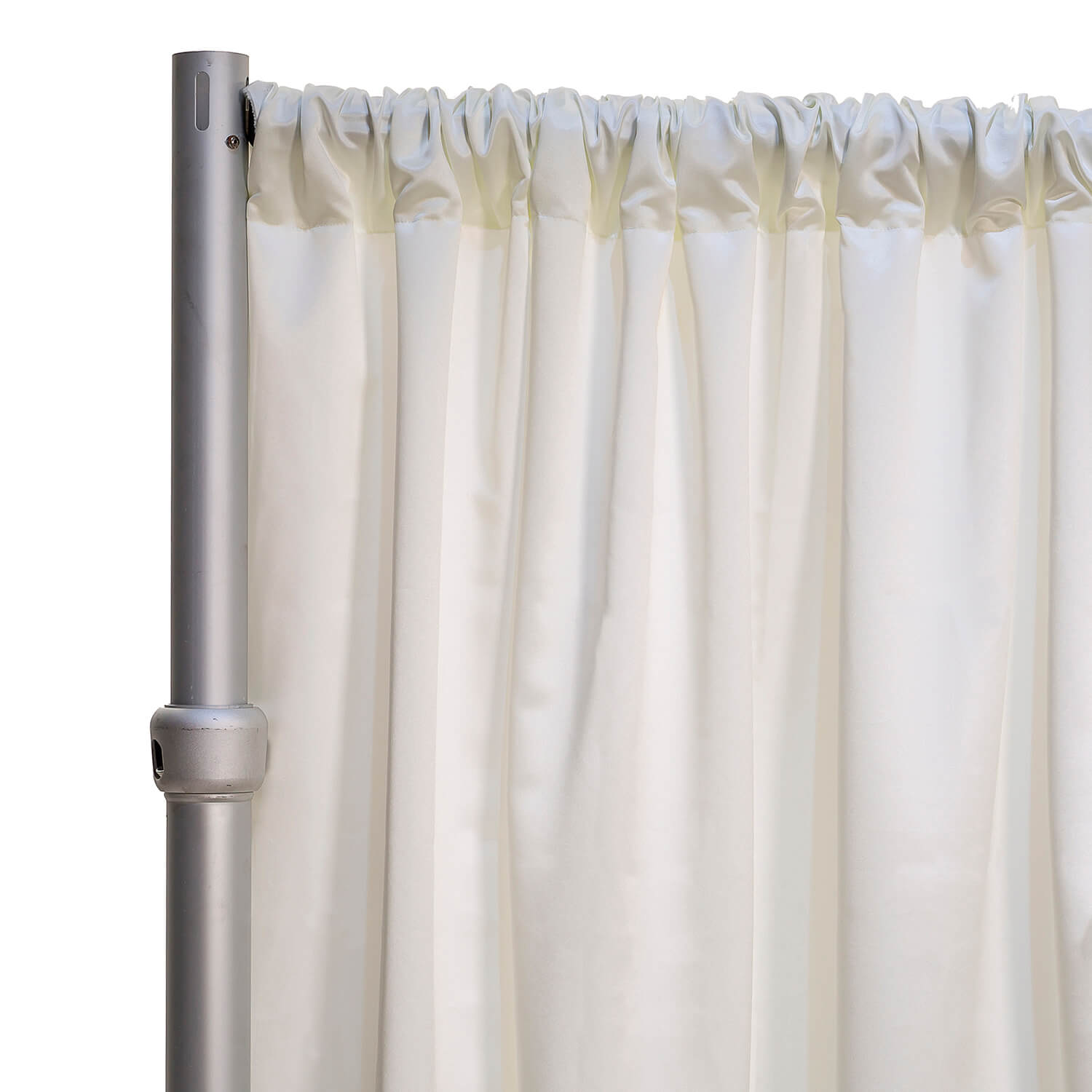 Accent and soften the ambience with these shimmering satin curtain panels. The satin features natural edges and is the same super-premium quality used in our luxe backdrops. And with 4" pocket rods on each end, you can hang them anywhere! Whether used as a backdrop or as a partition, they are just the lovely additions that the joyous occasion needs. Perfect for rustic or posh events, winter or spring. Often referred to as "bridal satin", this satin has slight matte finish which provides a beautiful shine only high quality fabrics can produce. For best appearance when using as drape, we recommend using 3-4 pieces of 5 ft wide luxe satin for every 10 feet of pipe. Sewing finishes such as rolled hem, surged edges and top finishes are available as upgrades.