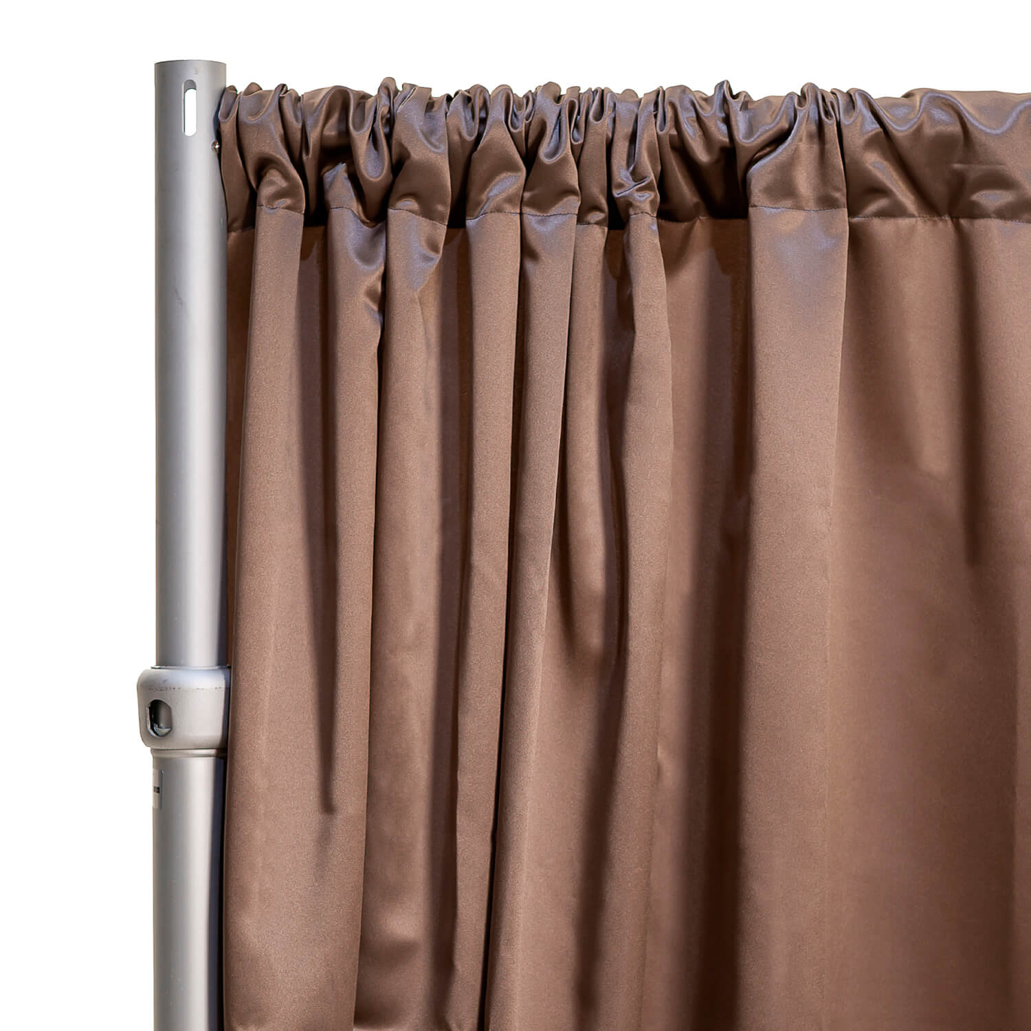 Accent and soften the ambience with these shimmering satin curtain panels. The satin features natural edges and is the same super-premium quality used in our luxe backdrops. And with 4" pocket rods on each end, you can hang them anywhere! Whether used as a backdrop or as a partition, they are just the lovely additions that the joyous occasion needs. Perfect for rustic or posh events, winter or spring. Often referred to as "bridal satin", this satin has slight matte finish which provides a beautiful shine only high quality fabrics can produce. For best appearance when using as drape, we recommend using 3-4 pieces of 5 ft wide luxe satin for every 10 feet of pipe. Sewing finishes such as rolled hem, surged edges and top finishes are available as upgrades.