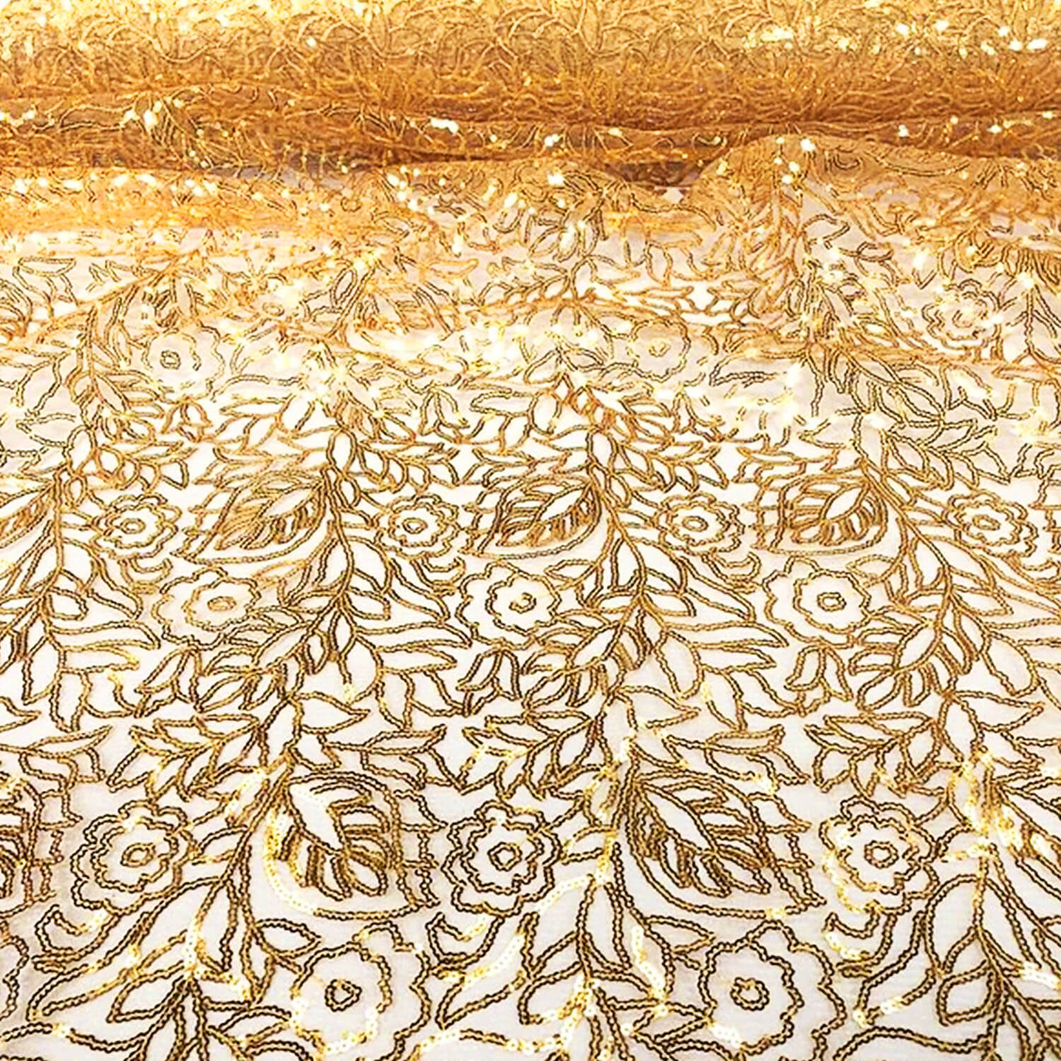 You can’t go wrong by choosing by using our gold fancy leaf sequin overlay. This gold fancy leaf sequin overlay is filled with embroidered flowers and leaves on a polyester sheer fabric and decorated with delicately placed sequins. Our many size options for this gold fancy leaf sequin overlay allow you to choose the right one for you.