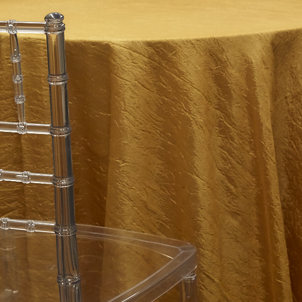 This gold crushed taffeta tablecloth decorates your event with a sparkling touch. Our gold crushed taffeta is a quality linen that we create our tablecloths out of. With many size options and the ease of taking care of it, you will be sure to find the right gold crushed taffeta tablecloth for you.