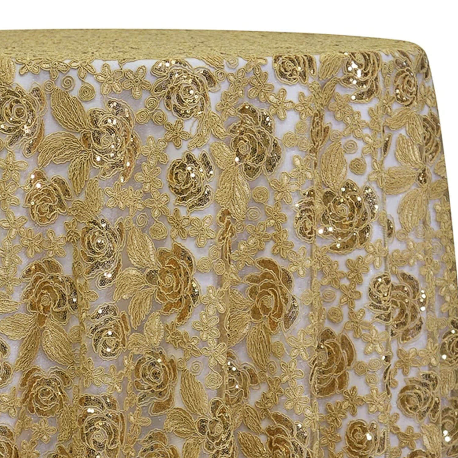 With this gold sweetheart lace overlay, you will give your decor a beautiful pattern and fresh look. The gold color stands out in the beautiful embroidered sweetheart lace overlay. With so many size options, you can find the perfect fit with our gold sweetheart lace overlay.