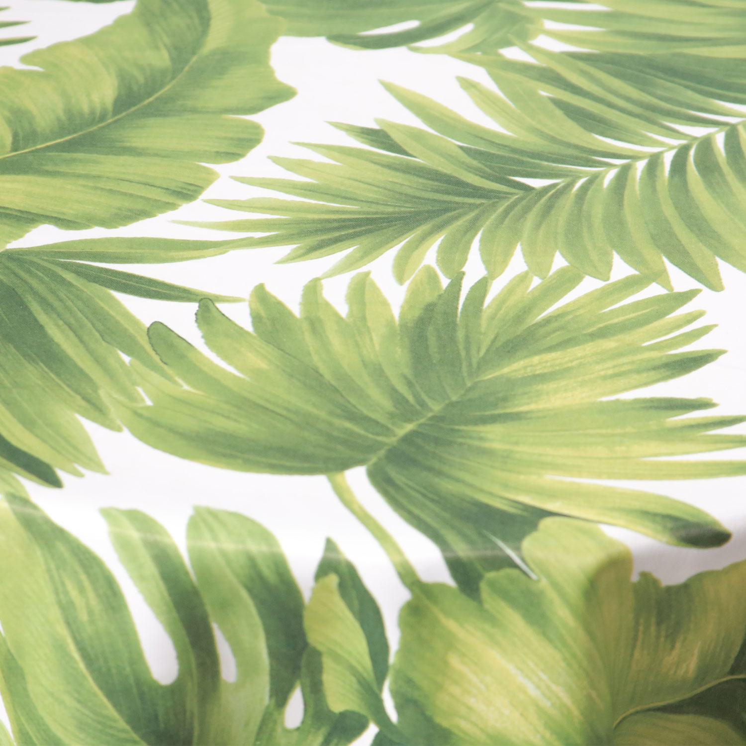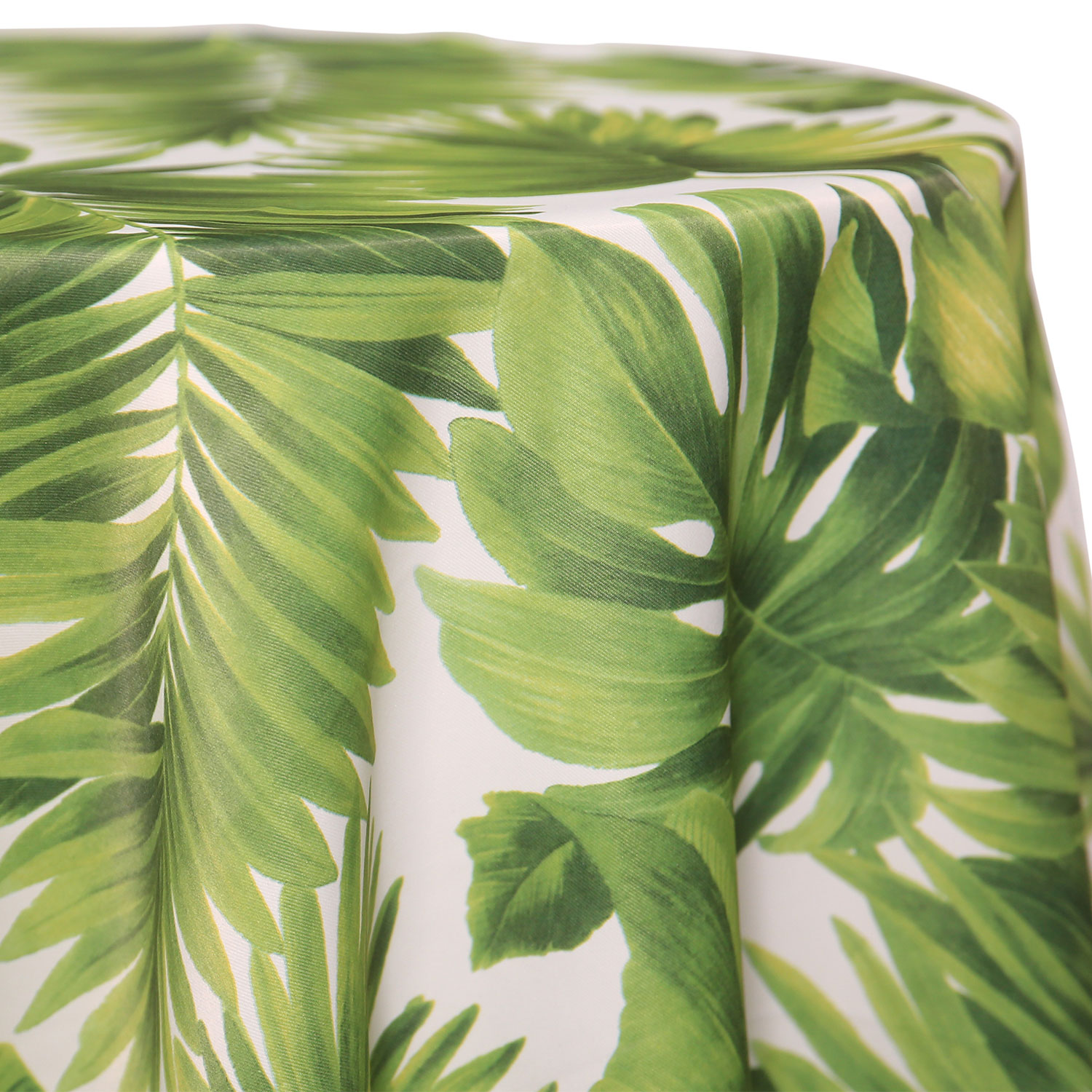 This bright green leaf pattern on a field of white will bring to mind warm weather and ocean breezes, perfect for any tropical themed event. The look of these pretty green fronds spread across the table tops will put everyone in a party mood. And the polyester material makes cleaning easy.