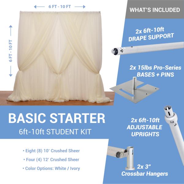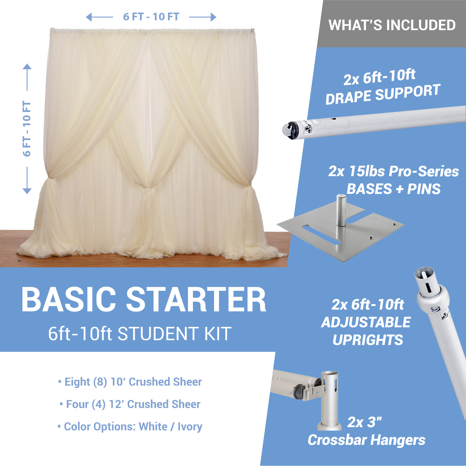 This Kit includes the following products: (2) 6ft-10ft Adjustable Upright (2) 18"x18" Heavy Duty Bases w/ Pins (2) 6ft-10ft Drape Supports (2) Small Double Crossbar Hangers (8) 10ft Crushed Sheer panels (your choice of White or Ivory) (4) 12ft Crushed Sheer Panels (your choice of White or Ivory)