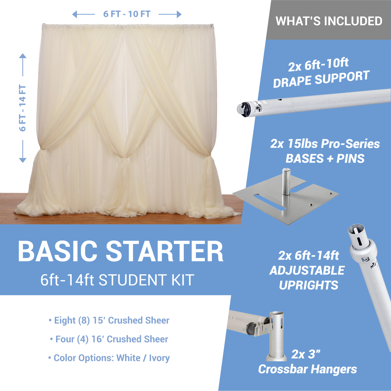 This Kit includes the following products: (2) 6ft-14ft 3-Piece Uprights (2) 18"x18" Heavy Duty Bases w/ Pins (2) 6ft-10ft Drape Supports (2) Small Double Crossbar Hangers (8) 10ft Crushed Sheer panels (your choice of White or Ivory) (4) 12ft Crushed Sheer Panels (your choice of White or Ivory)