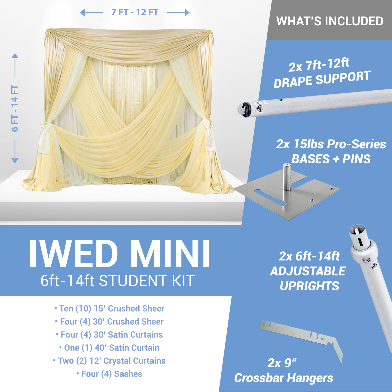 This Kit includes the following products: (2) 6ft-14ft 3-Piece Uprights (2) 18"x18" Heavy Duty Bases (2) 7ft-12ft Drape Supports (2) Large Double Crossbar Hangers (10) 15ft Crushed Sheer panels (your choice of all Colors) (4) 30ft Crushed Sheer Panels (your choice of all Colors) (4) 30ft Satin Panel (your choice of Silver, Gold, Black or Dark Purple) (1) 40ft Satin Panel (your choice of Silver, Gold, Black or Dark Purple) (4) Sashes (your choice of Silver, Gold, Black or Dark Purple) (2) Decostar™ 12ft Jewel Crystal Iridescent Diamond Cut Curtain