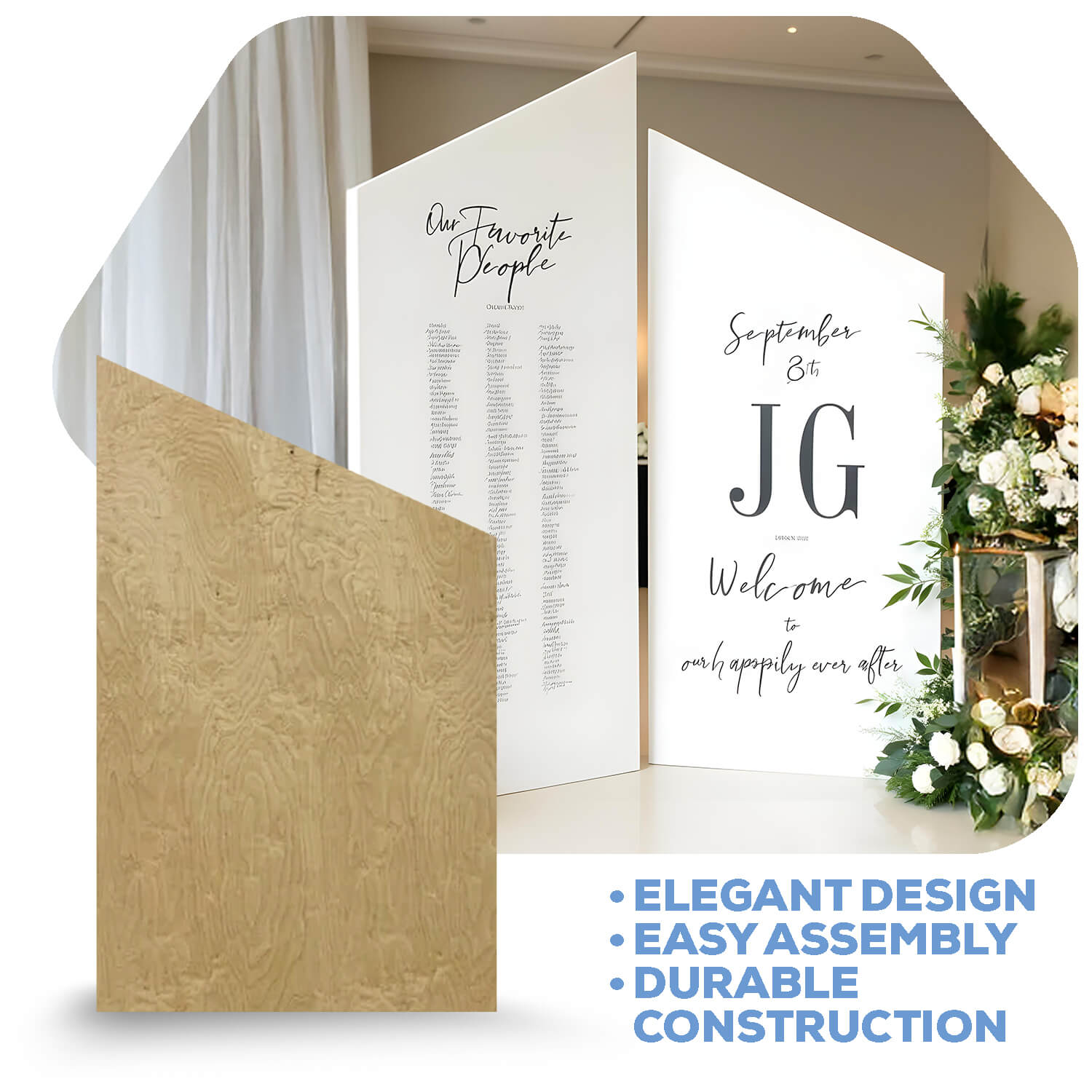 These wood panels made from ½ birch plywood (with the exception of Ripple panels are made with ¾ MDF) are perfect for all sorts of events, occasions, and themes. Whether used as a stage prop for a play or as an architectural feature for a photobooth backdrop display, you can't go wrong. Each collapsible panel also has additional supports at the base and middle where the panel is able to fold in half making transportation and storage a cinch. Bear in mind, though, that the panels will arrive unfinished, so let your imagination run free! Drape them with dreamy fabrics or cover them with gilded spray paint. There are so many options available to meet you desires and designs.