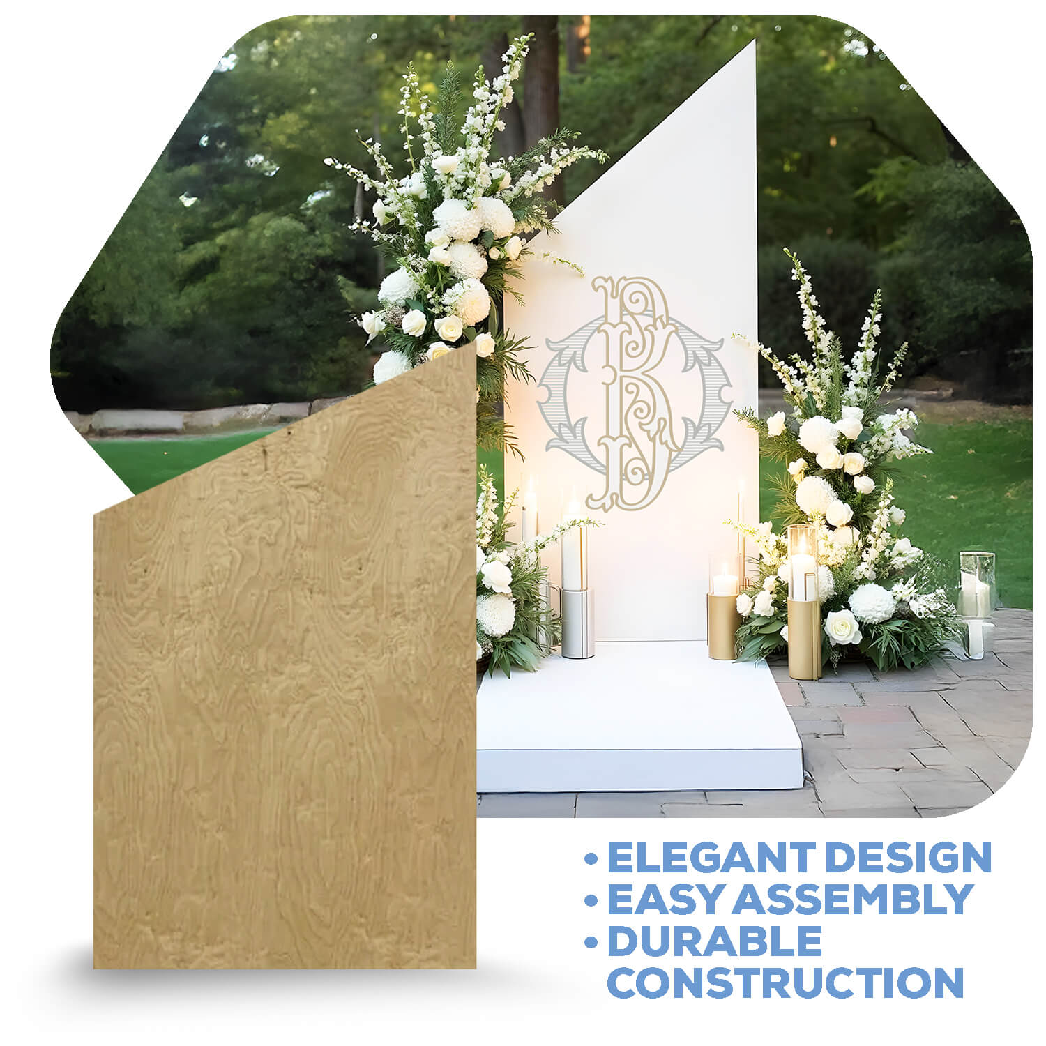 These wood panels made from ½ birch plywood (with the exception of Ripple panels are made with ¾ MDF) are perfect for all sorts of events, occasions, and themes. Whether used as a stage prop for a play or as an architectural feature for a photobooth backdrop display, you can't go wrong. Each collapsible panel also has additional supports at the base and middle where the panel is able to fold in half making transportation and storage a cinch. Bear in mind, though, that the panels will arrive unfinished, so let your imagination run free! Drape them with dreamy fabrics or cover them with gilded spray paint. There are so many options available to meet you desires and designs.