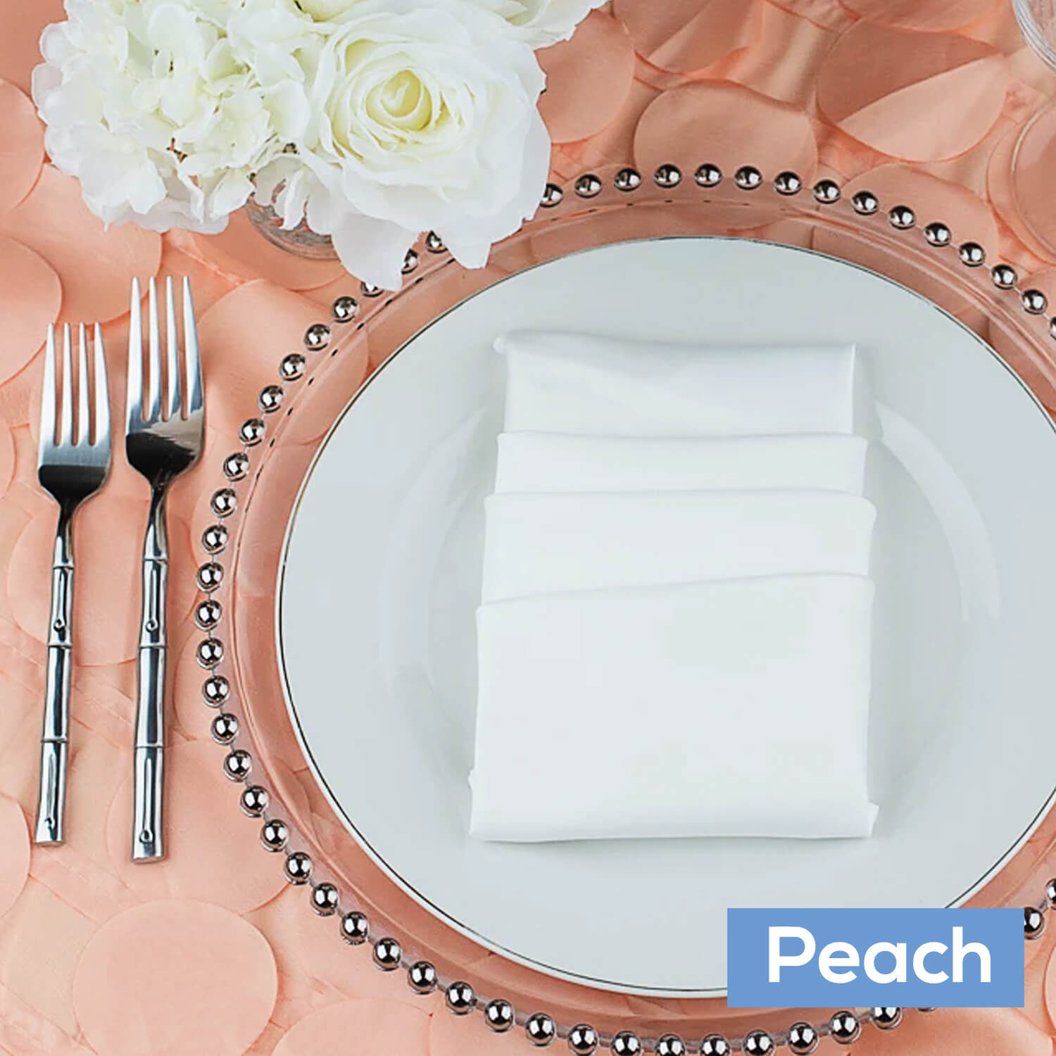 The soft peach of this overlay draws the eye, and adds a regal and luxurious look perfect for weddings and more formal events where you still want a bit of playfulness paired with an overall classic style. Soft lighting and candles offset the look, and catch the fabric’s natural sheen perfectly. These tablecloths are part of our larger Large Petal Gatsby Circle Line which includes table runners and fabric rolls, Mix and match for a coordinated decorative theme.