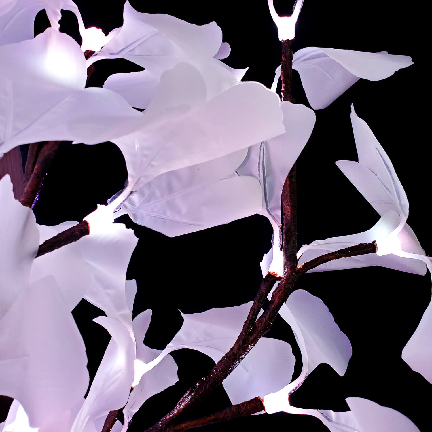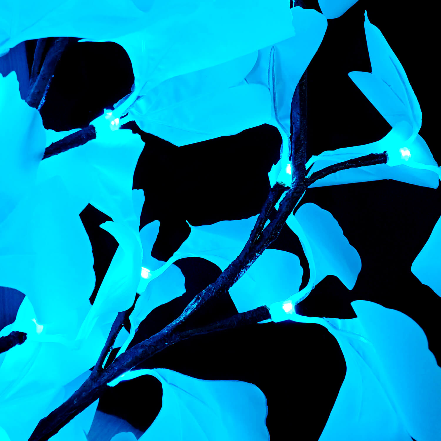 Branches, stretching out from the trunk, are filled with tiny ginkgo blossoms, each with a small LED light placed behind it. When turned on, these blossoms bathe a space in warm white light, or a variety of colors creating scenes straight from a fairytale.