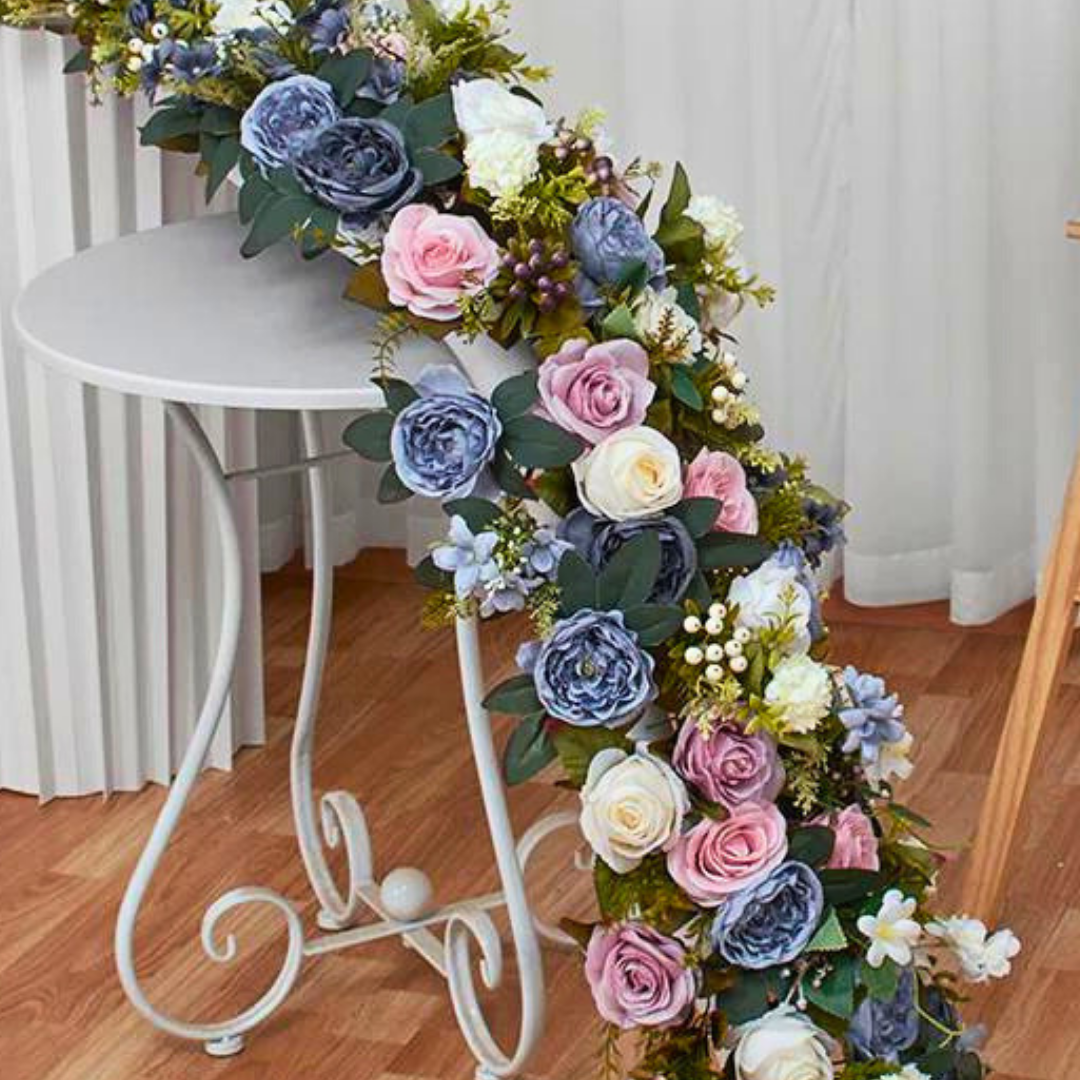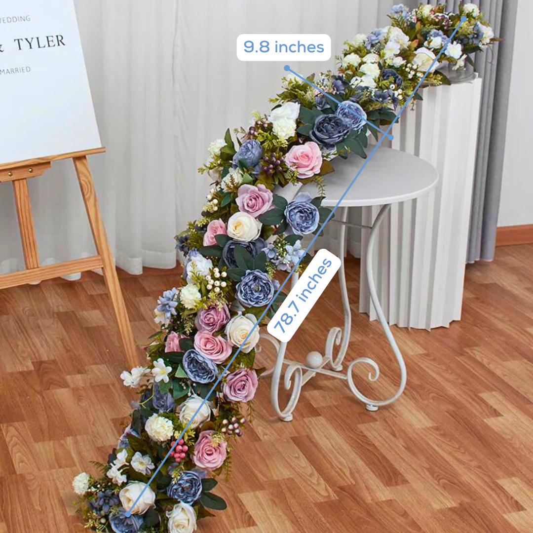 Elevate your table decor with some exquisite, extravagant floral table runners that radiantly capture the essence of elegance. Made of high quality silk and sturdy foam, they are ideal for wedding receptions, formal events, and so much more. They're incredibly versatile and will create captivating focal points no matter where they are, turning any room into a bright and bustling floral wonderland. Finally, elegance and sophistication without any of the maintenance. They're sure to leave a lasting impression. The harmonious blend of blue and pink roses alongside lush greenery makes them especially charming.