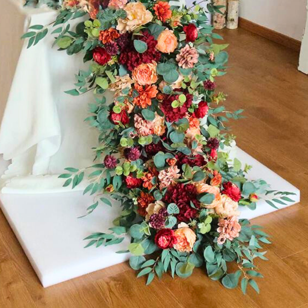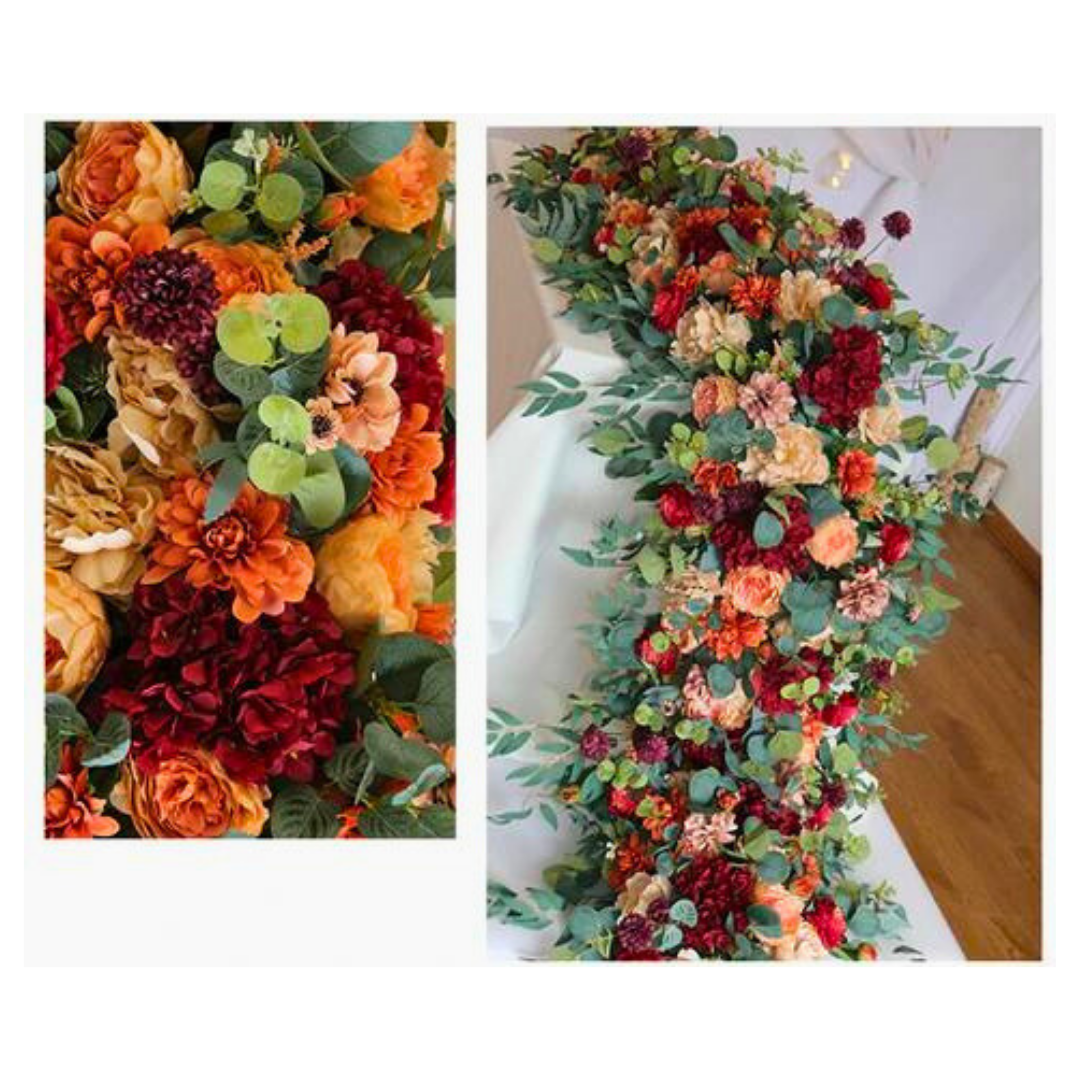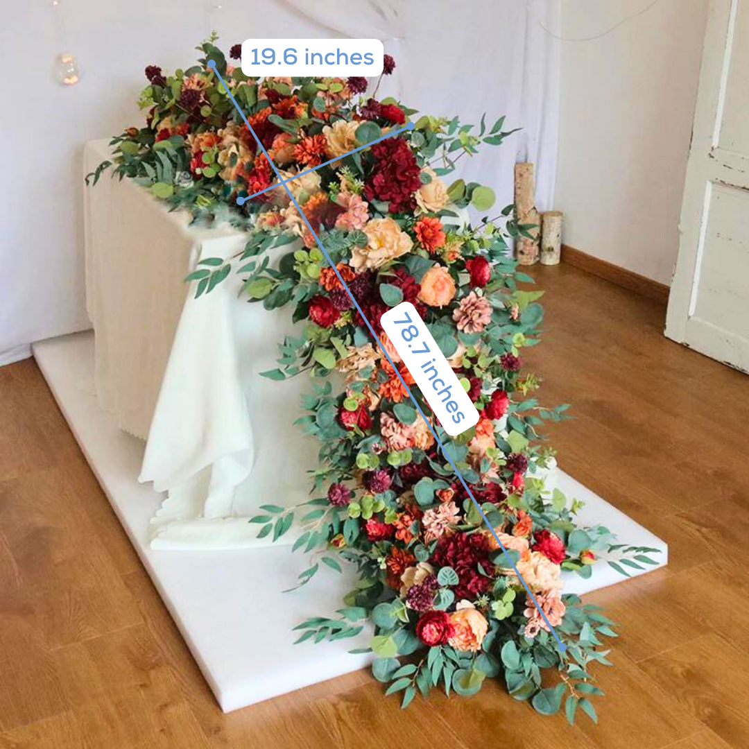 Elevate your table decor with some exquisite, extravagant floral table runners that radiantly capture the essence of elegance. Made of high quality silk and sturdy foam, they are ideal for wedding receptions, formal events, and so much more. They're incredibly versatile and will create captivating focal points no matter where they are, turning any room into a bright and bustling floral wonderland. Finally, elegance and sophistication without any of the maintenance. They're sure to leave a lasting impression. The harmonious blend of burgundy rose and eucalyptus makes them especially charming.