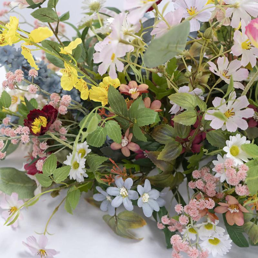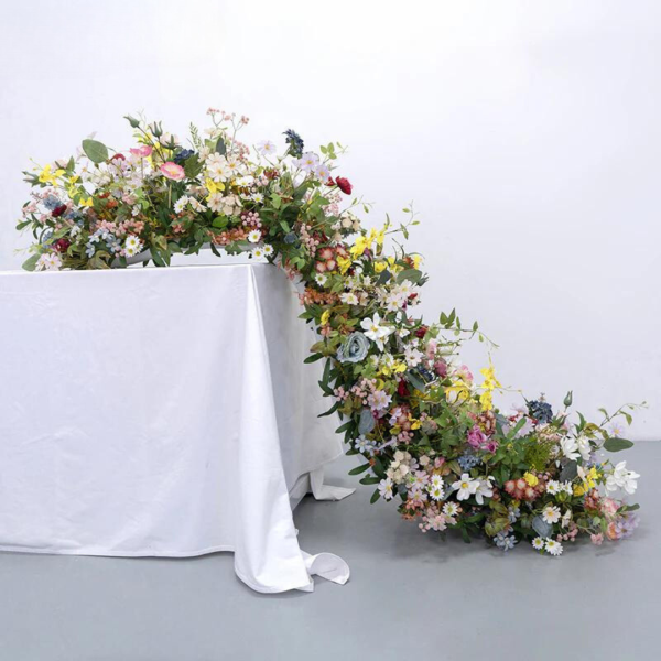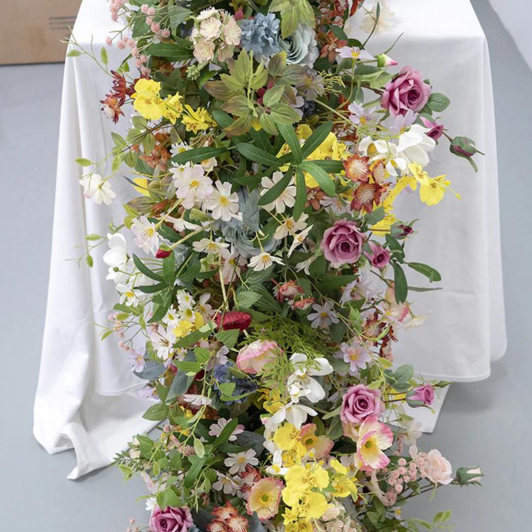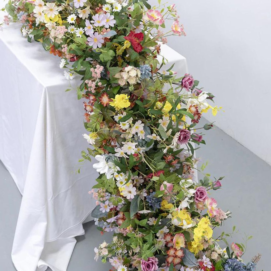Elevate your table decor with some exquisite, extravagant floral table runners that radiantly capture the essence of elegance. Made of high quality silk and sturdy foam, they are ideal for wedding receptions, formal events, and so much more. They're incredibly versatile and will create captivating focal points no matter where they are, turning any room into a bright and bustling floral wonderland. Finally, elegance and sophistication without any of the maintenance. The colorful and harmonious blend of daisies, poppies, and green leaves is sure to leave a lasting impression.