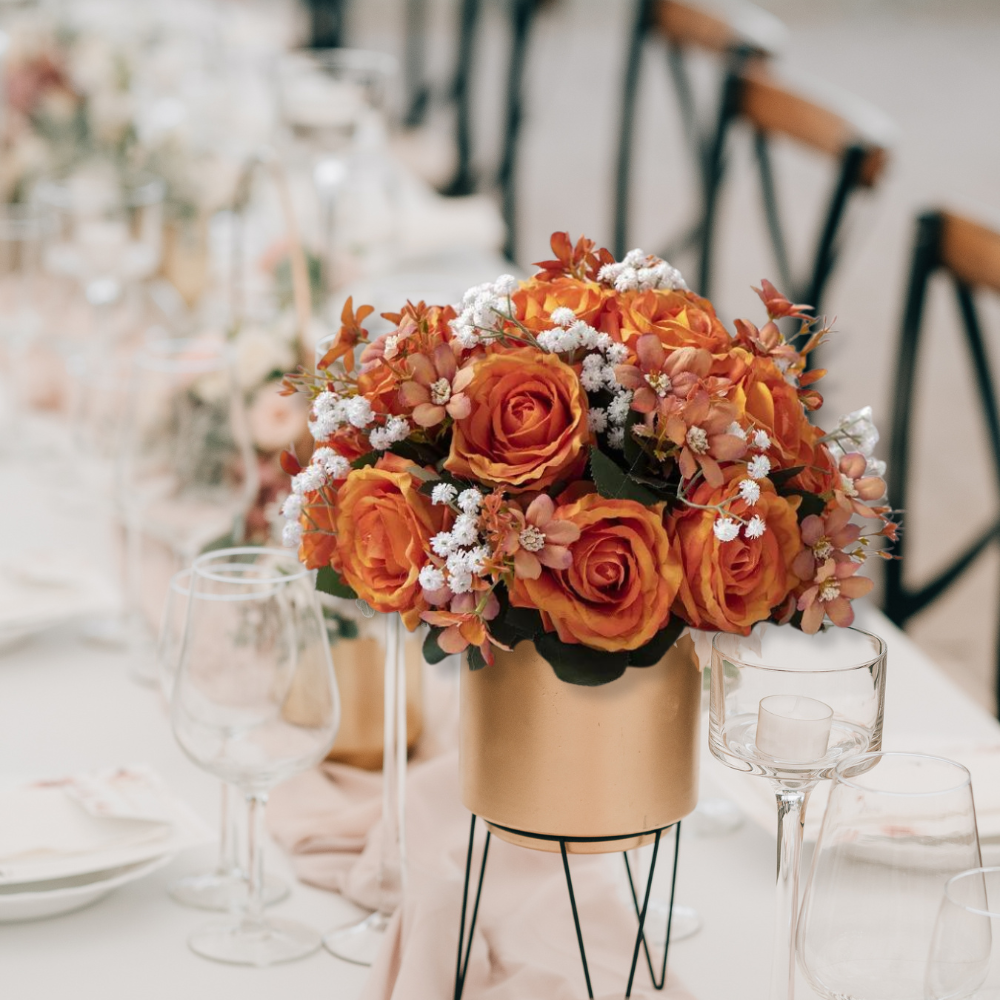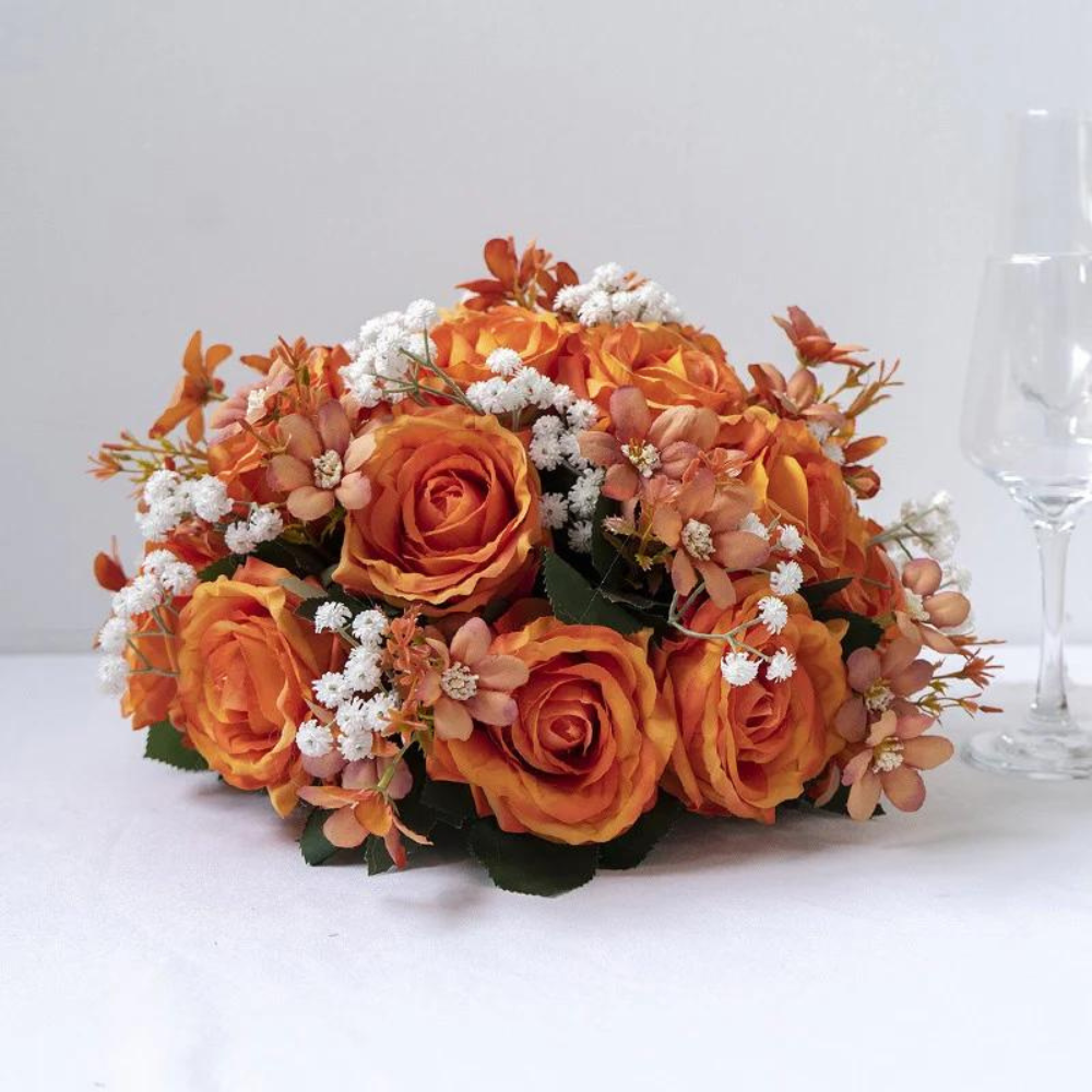 Add a touch of timeless beauty with these rose and baby's breath centerpieces. Ideal for weddings and formal events and bridal showers, but they can also be used for your own home decor in bathrooms, common areas and even outdoors. With these lifelike, elegant bouquets, you can turn any room into a floral wonderland. Finally, whimsy and elegance without any of the maintenace! The orange hue makes them especially cheerful.