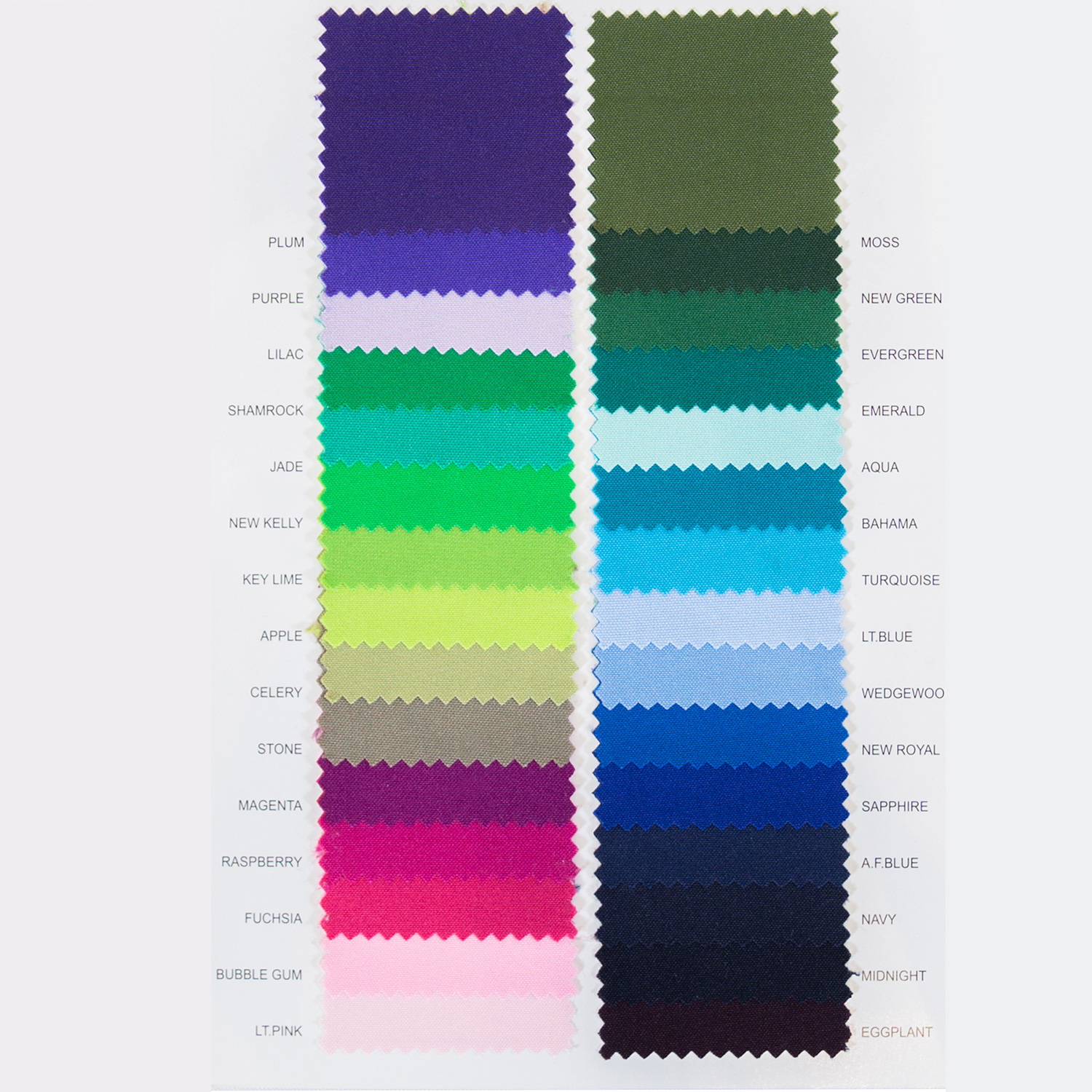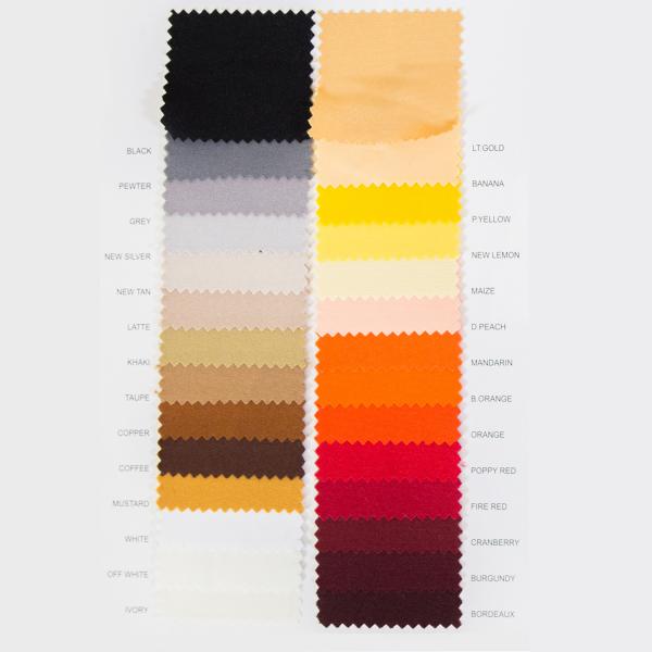 COLORS: A.F. Blue, Apple, Aqua, B.Orange, Bahama, Banana, Black, Bordeaux, Bubble Gum, Burgundy, Celery, Coffee, Copper, Cranberry, D.Peach, Eggplant, Emerald, Evergreen, Fire Red, Fuchsia, Ivory, Jade, Key Lime, Khaki, Latte, Lilac, Lt. Gold, Lt. Blue, Lt. Pink, Magenta, Maize, Mandarin, Midnight, Moss, Mustard, Navy, New Green, New Kelly, New Lemon, New Royal, New Silver, New Tan, Off White, Orange, P. Yellow, Pewter, Plum, Poppy Red, Purple, Raspberry