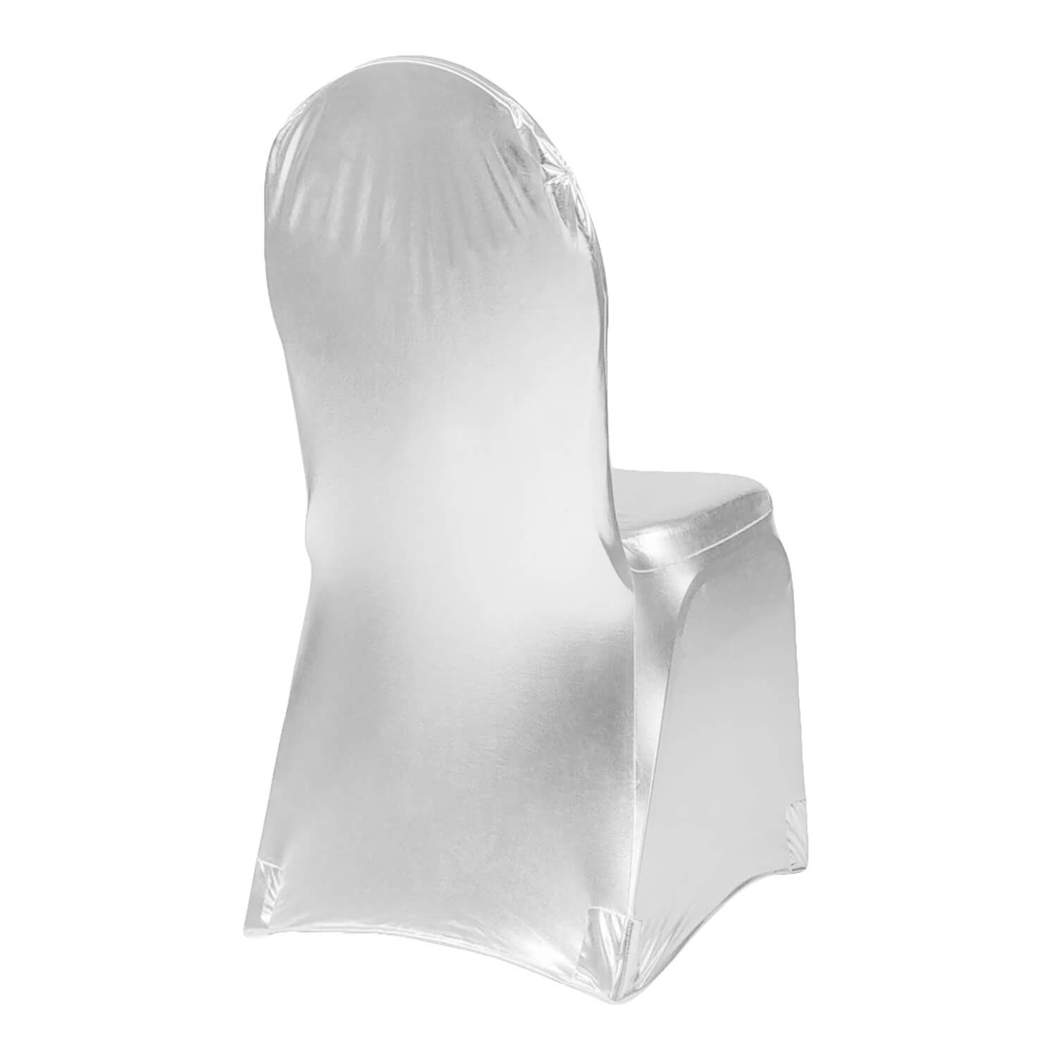 Our silver metallic spandex chair covers turns your chairs into a glamorous masterpiece for your decor. Our high-quality silver spandex fabric is carefully sewn to provide you with a durable product you can wash and reuse them. Stretch the silver spandex chair covers over your chair and you will instantly turn your event from basic and simple to sparkling and amazing.