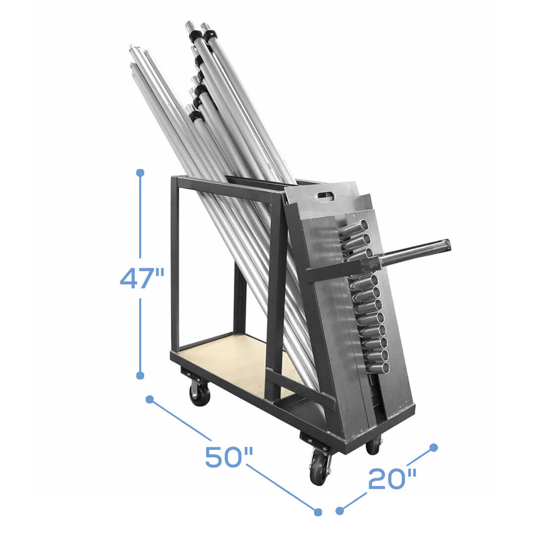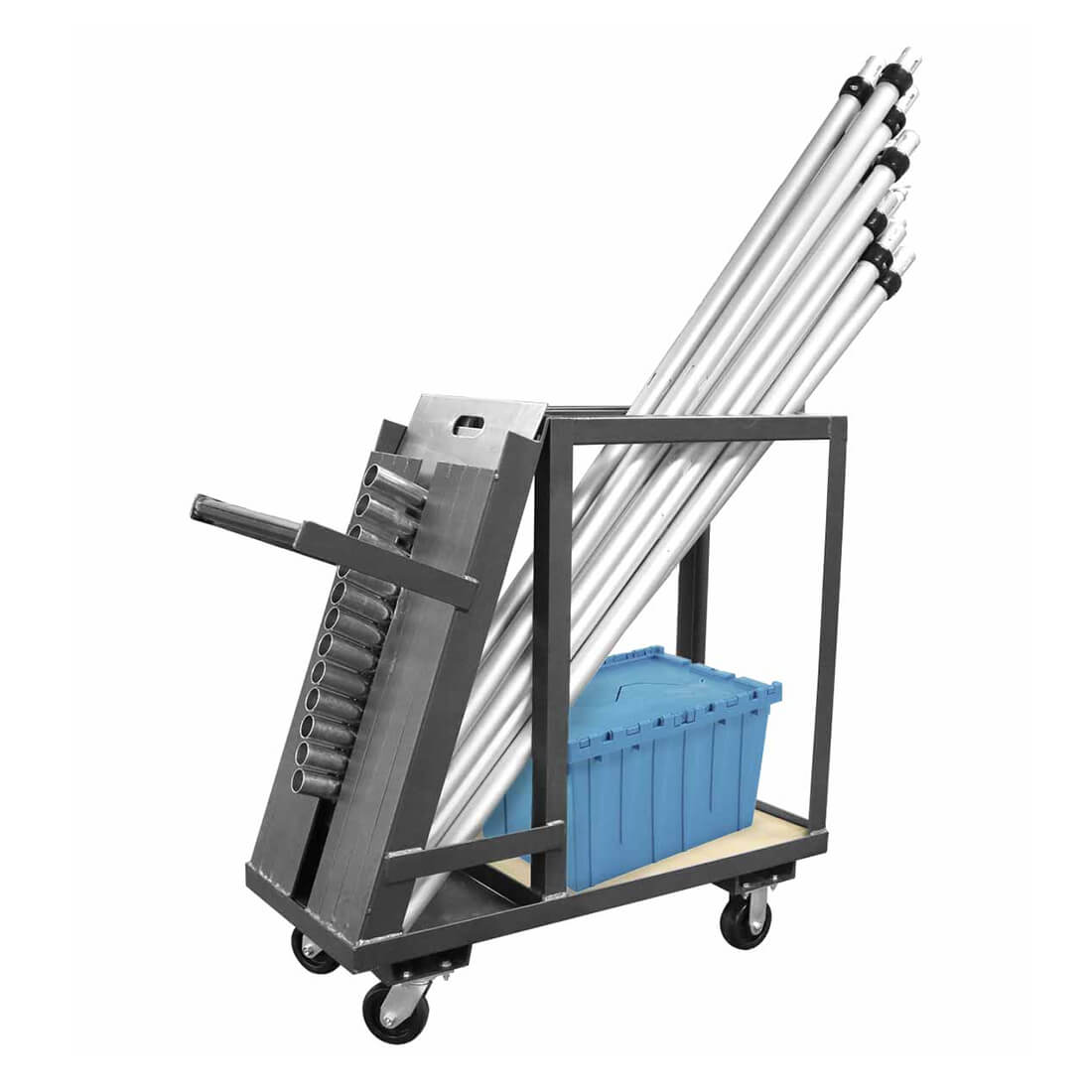This heavy-duty storage cart is not only sleek but durable and dependable. Designed with the AV professional in-mind, it stores the perfect amount pipe and drape. The top compartment features three sections where you can stand up uprights and drape supports while your 18″ base plates allow you to stagger-stack along the front of the cart. So if you need a compact solution for transporting your equipment, this one is for you. Reduce set-up time and protect your investment today. Perfect for installs in churches, schools, and hotels.