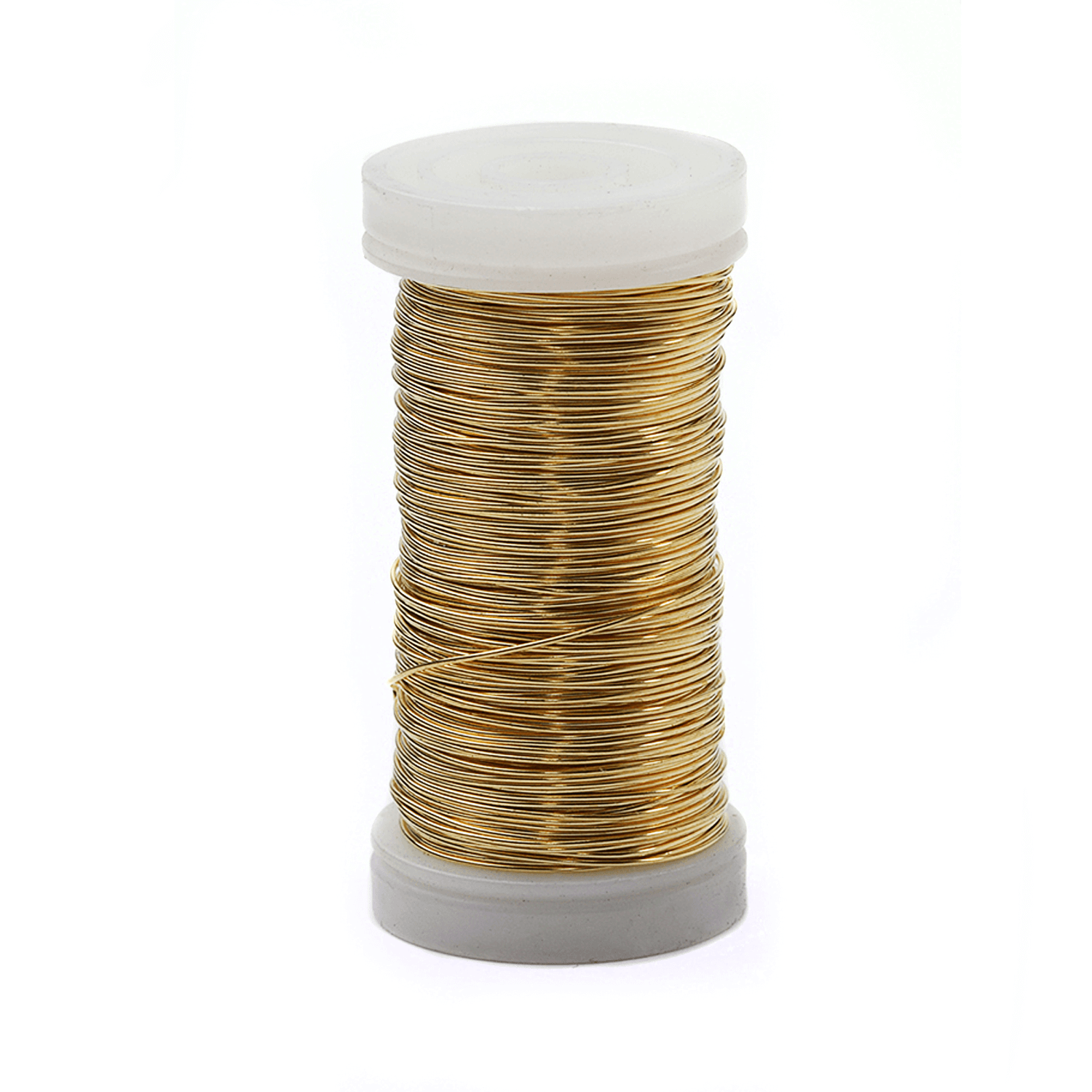 Add some sparkle to your decorative displays with our golden, metallic wire. Use to attach decorative items to any display, to hang items, or for molding and bending into decorative elements to enhance your décor. This flexible wire blends in well with many design themes and display elements, but because of its metallic base, it enhances that look, playing with light and adding a bit of sparkle.