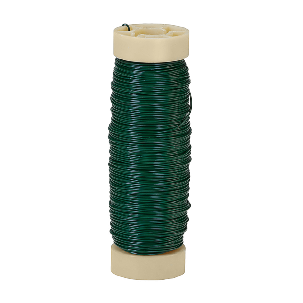 Let your imagination run wild, but stay in creative control with this spool wire. Triple coated with a dark green finish, it is generally used to secure flowers and greenery to all sorts of surfaces and objects such as staircases, banisters, chuppahs, and more. So whether decorating for a wedding or birthday party, a celebratory or funerary occasion, you won't want to do without this handy structural element. Just wrap around any flower stem and cover the wire with some floral tape and you're ready to go. It can also be used to secure bows to flower arrangements, and greenery or cones to wreath frames. Just remember, the higher the gauge the thinner the wire, the thinner the wire, the more malleable and sturdy the design.