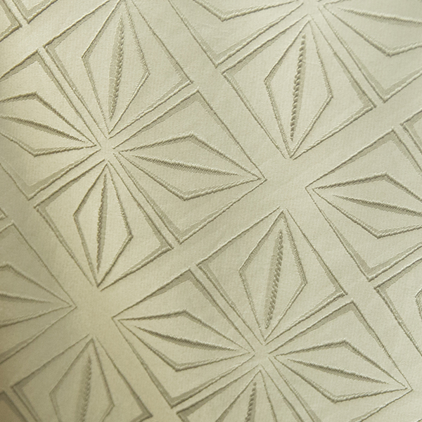This geometric pattern is both modern looking, and yet has a more decorative feel to it. Four diamonds, each enclosed in a square, and all four squares arranged in a diamond pattern set into a platinum colored fabric brings a sense of rhythm and balance to the pattern, but offers depth. There is something almost floral about the design, but the straight lines keep it from being feminine.
