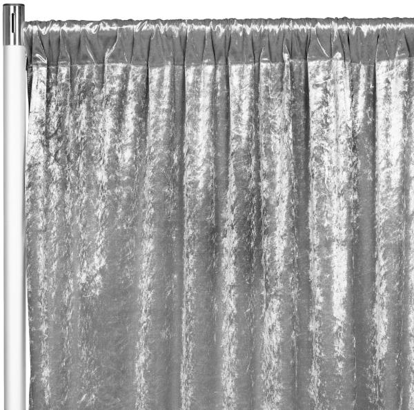 Premade Velvet Backdrop Curtain 18ft Long x 52in Wide in Silver Color: Silver Dimension: 18ft height x 52in width Pockets: 4" on top Material: Velvet