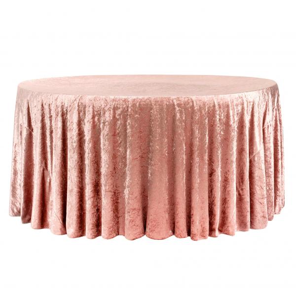 Color: Cinnamon Rose Material: Velvet Size: Approx. 120" Round with seams Drop: A 120" Tablecloth over a 60" Round Table (standard 30" table height) will touch the floor. A 120" Tablecloth over a 72" Round Table (standard 30" table height) will hang 6" above the floor.
