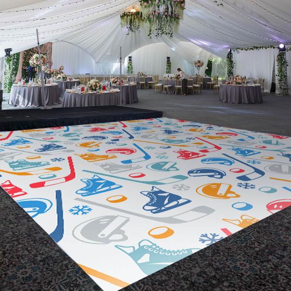 Transform your venue with this custom size dance floor wrap! Made of high-quality, low-tac, dot adhesive vinyl which is temporary and easy to remove, the material can be used on hardwood floors, event dance floors, or polished concrete. The choice is yours. It's time to dance the night away with these dazzling floor fabrics! Our Hockey Play design belongs to our "Boys Birthday" print designs for your most upscale events.