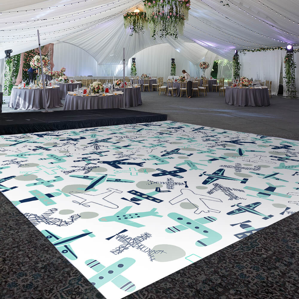 Transform your venue with this custom size dance floor wrap! Made of high-quality, low-tac, dot adhesive vinyl which is temporary and easy to remove, the material can be used on hardwood floors, event dance floors, or polished concrete. The choice is yours. It's time to dance the night away with these dazzling floor fabrics! Our Jet Set design belongs to our "Boys Birthday" print designs for your most upscale events.