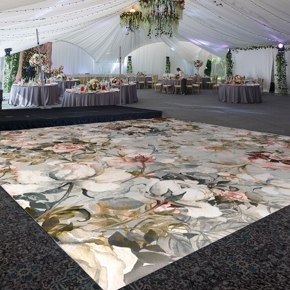 Transform your venue with this custom size dance floor wrap! Made of high-quality, low-tac, dot adhesive vinyl which is temporary and easy to remove, the material can be used on hardwood floors, event dance floors, or polished concrete. The choice is yours. It's time to dance the night away with these dazzling floor fabrics!  Our Neutral Damask design belongs to our "Classical" print designs for your most upscale events.