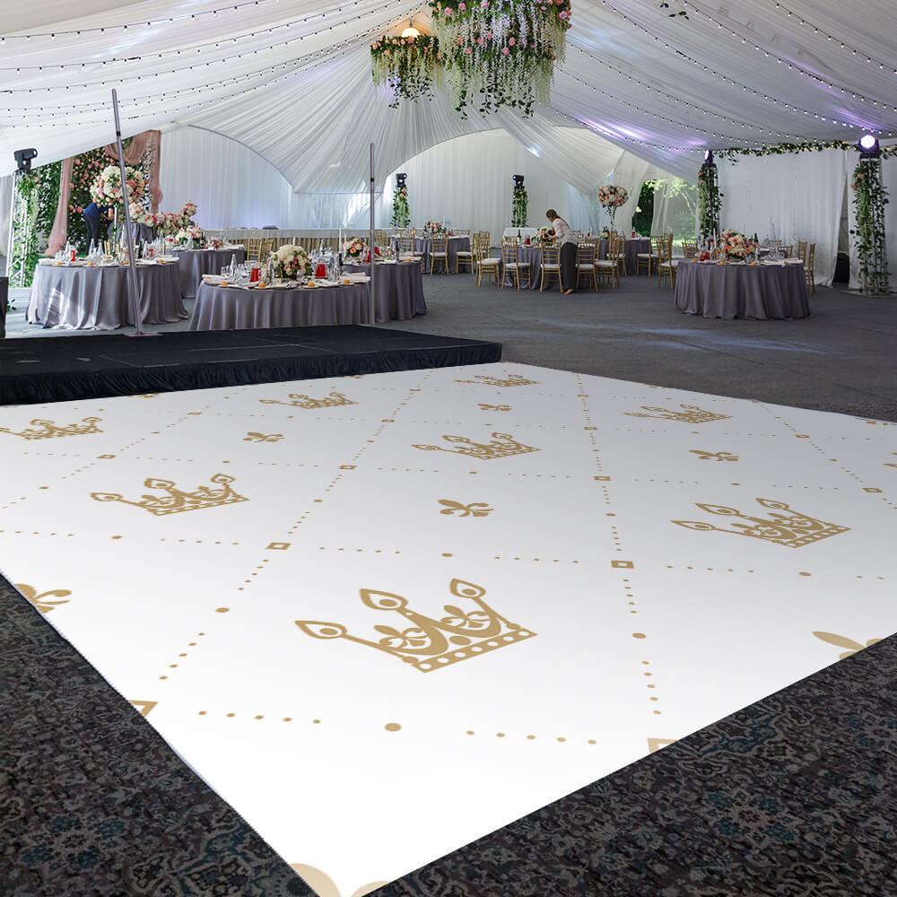 Transform your venue with this custom size dance floor wrap! Made of high-quality, low-tac, dot adhesive vinyl which is temporary and easy to remove, the material can be used on hardwood floors, event dance floors, or polished concrete. The choice is yours. It's time to dance the night away with these dazzling floor fabrics!