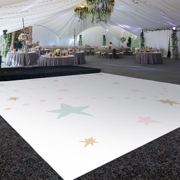 Transform your venue with this custom size dance floor wrap! Made of high-quality, low-tac, dot adhesive vinyl which is temporary and easy to remove, the material can be used on hardwood floors, event dance floors, or polished concrete. The choice is yours. It's time to dance the night away with these dazzling floor fabrics! Our Twinkle, Twinkle design belongs to our "Girls Birthday" print designs for your most upscale events.