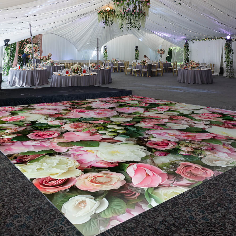 Transform your venue with this custom size dance floor wrap! Made of high-quality, low-tac, dot adhesive vinyl which is temporary and easy to remove, the material can be used on hardwood floors, event dance floors, or polished concrete. The choice is yours. It's time to dance the night away with these dazzling floor fabrics!