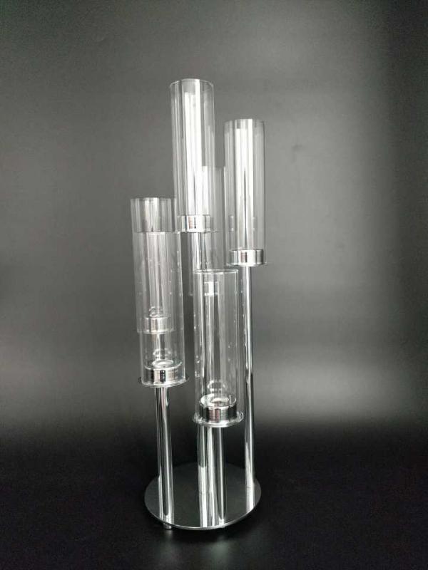 Create a soft and ethereal atmosphere with these elegant candelabras. Equiped with six silver metal arms mounted to glass in staggered formation, they not only emanate a twinkling, romantic glow but are dazzling centerpieces in their own right. They can also be used to line aisles and further embellish floral arrangements. Ideal for weddings, birthdays, communions and more. Best when used with tall taper candles and especially effective when placed near mirrors and windows at night.