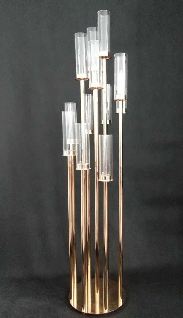 Create a soft and ethereal atmosphere with these elegant candelabras. Equiped with twelve gold metal arms mounted to glass in staggered formation, they not only emanate a twinkling, romantic glow but are dazzling centerpieces in their own right. They can also be used to line aisles, liven altars, and further embellish floral arrangements. Ideal for weddings, birthdays, communions and more. Best when used with tall taper candles and especially effective when placed near mirrors and windows at night in nooks, anterooms, and halls.