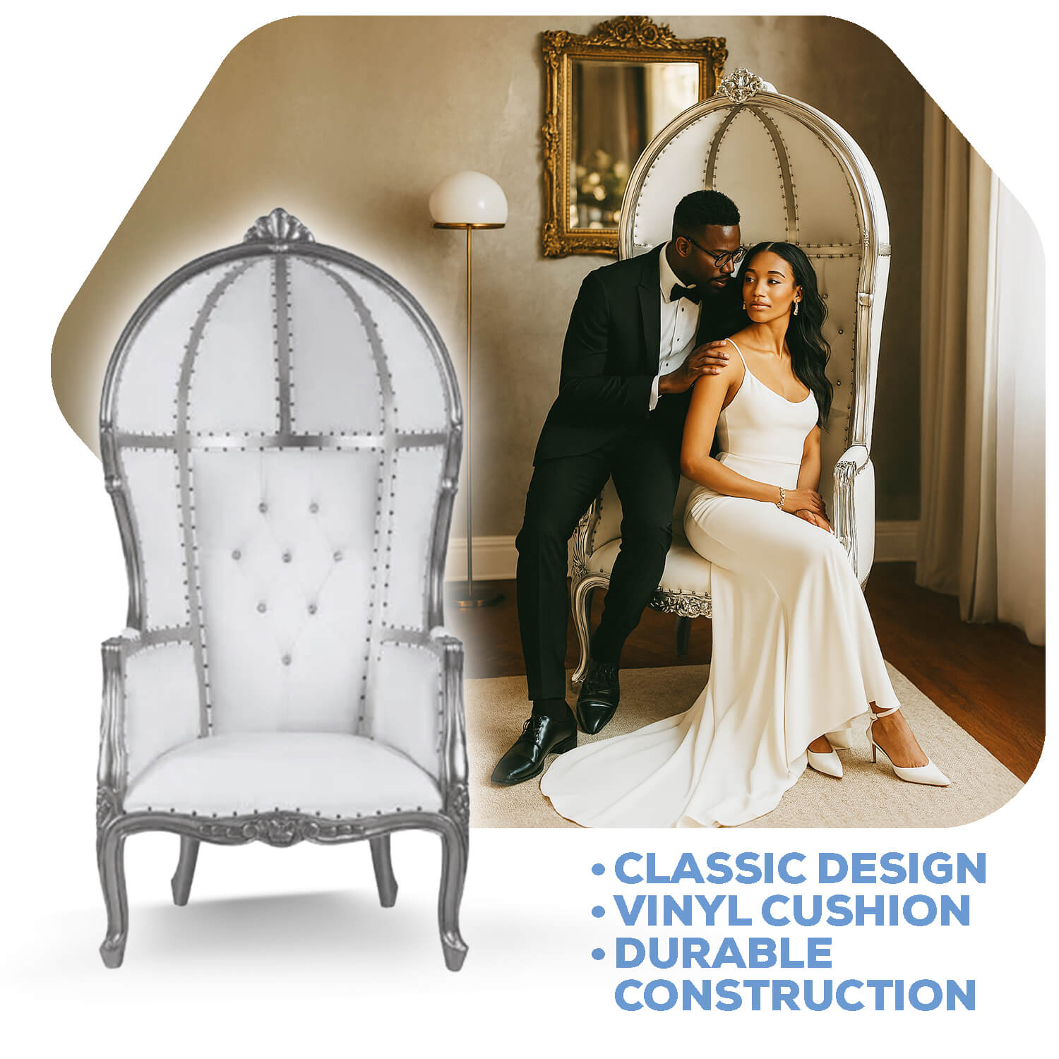 Throne Chairs are available in Gold frame with white vinyl, gold frame with red vinyl and silver frame with white vinyl. No matter the color, you'll always feel like royalty in our Wood Frame Throne Chairs.