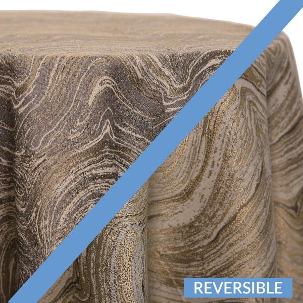 Colors swirl like shifting sands across the face of these table linens. Looking at this pattern you will be transported to far flung desserts or distant remote beaches. Swirls in beige, tan and, light slate off set each other in a pattern that looks like it’s moving. This color combination also has a sparkling effect, much like shifting sand. The double sided pattern means that you can get a different variation just by turning the cloth over. Mix and match for a unique look that color coordinates and brings a dramatic yet whimsical look to your event.